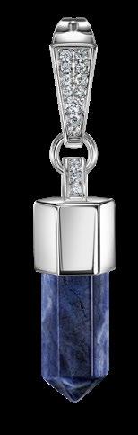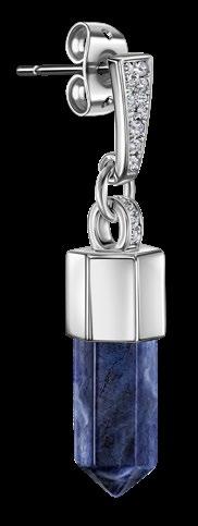 Latón, circonita cúbica, piedra de sodalita natural, broches de titanio. Baño de plata, recubrimiento electroforético. Seguro de níquel. Medidas: 3.4 cm. 15 unidades disponibles.