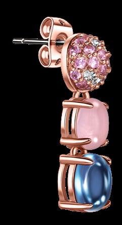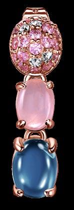 Latón, piedra de cuarzo rosa natural, vidrio, cristales de circonita cúbica, pasador de titanio. Baño de oro rosa. Largo: 2.5 cm. 60 unidades disponibles.