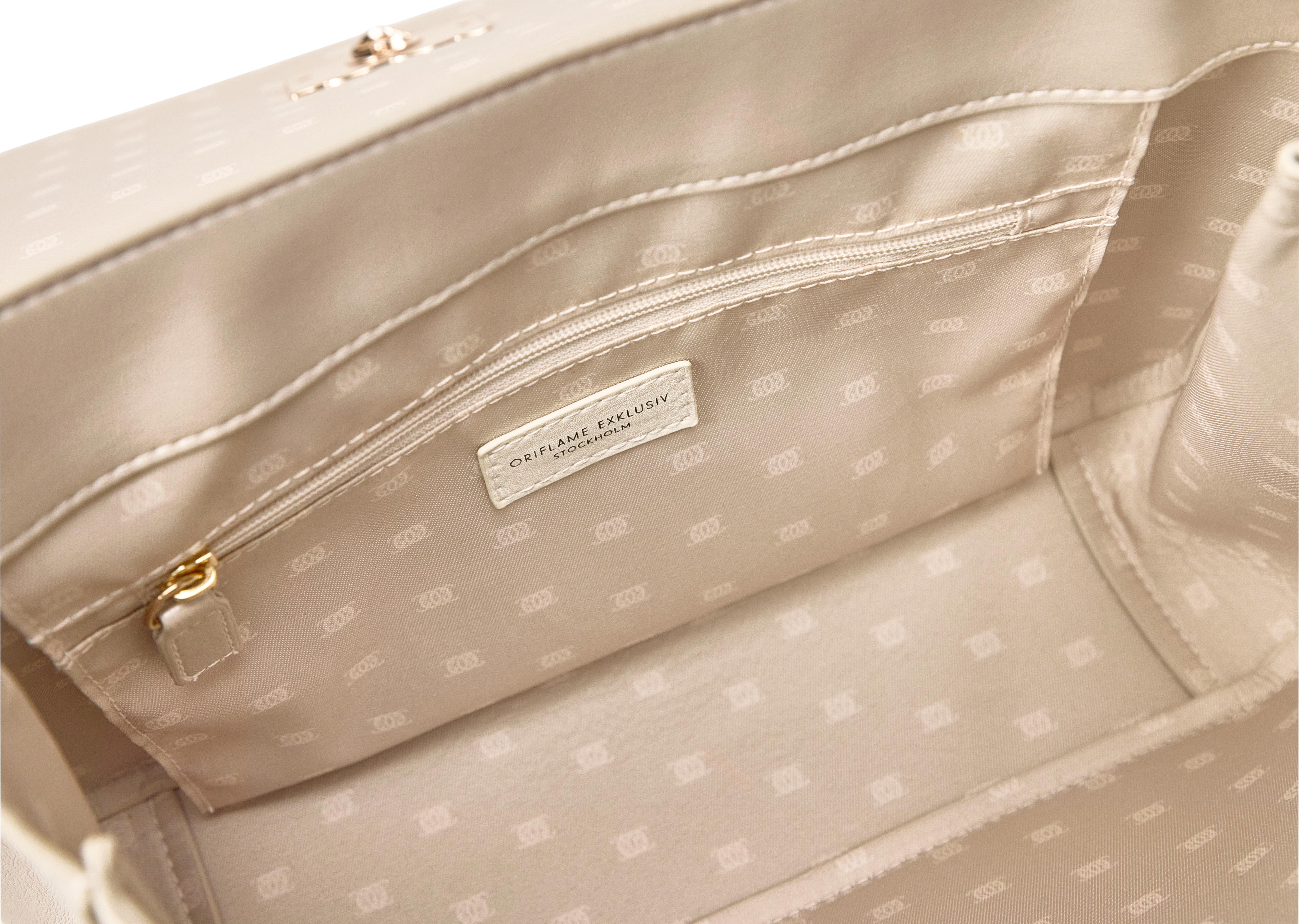 Esta hermosa cartera, esta confeccionada en piel sintética producida conscientemente, cuenta con una correa de cadena deslizante. Se puede llevar al hombro o cruzado.