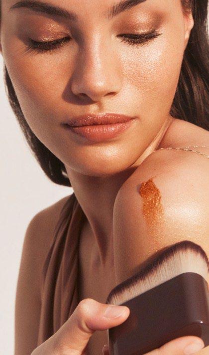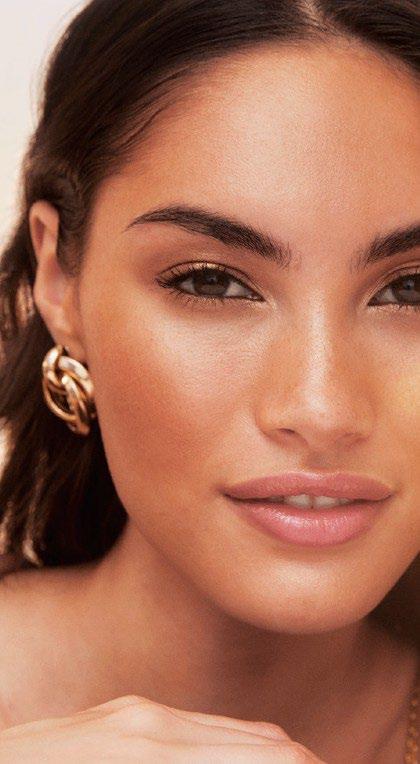 Para unificar el tono facial, aplica una base sedosa y luminosa como Eternal Glow y luego, coloca nuestra nueva Tinta Bronceadora debajo de los pómulos, contorno de frente, nariz y barbilla. ¡También puedes usarla en el cuerpo, difuminando con la brocha Bronceadora!