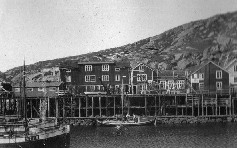 Bryggerekka på Nyksundøya i 1930. I 1934 ble bryggene jevnet med jorda som følge av en stor brann. Båten som ligger seilingsklar ved kaia, er fembøringen «Nordstjerna». Den var eid av Simon Skog i Nyksund. «Nordstjerna» seilte fra Nyksund til Trondheim for å delta på Trøndelagsutstillingen i 1930. Bryggerekka fra venstre: Skogbruket med Egnarbua, Sørvågbua, Ellenstuloftet, Ellenstua og Skogbutikken. Withbruket (det hvite huset i høyre kant) og Withbutikken. Foto: Sverre Wallan.
