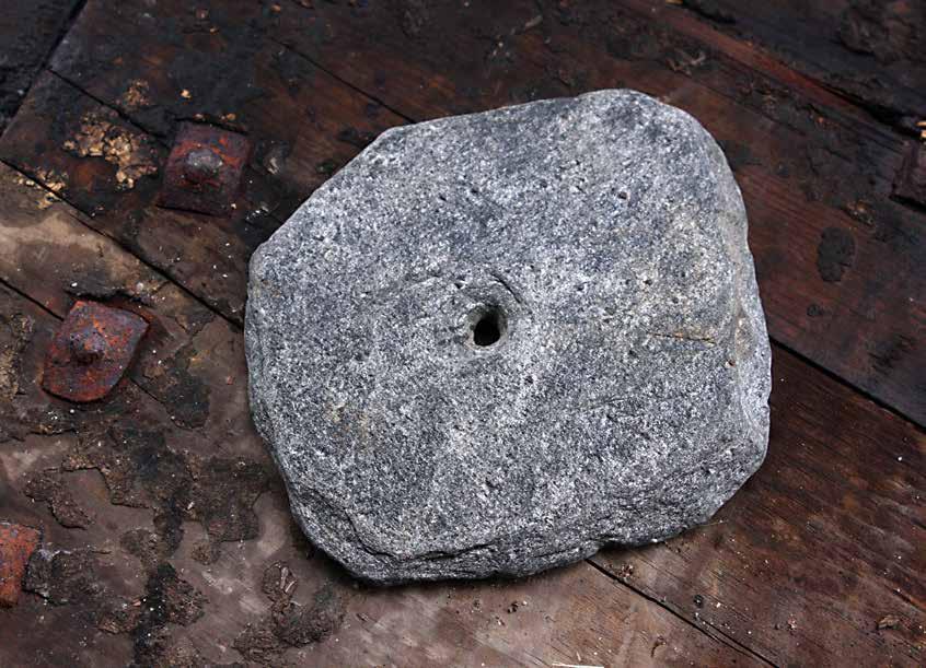 Naustet var rast sammen, og det var bare noen rester igjen. Inne ved en av veggene fant jeg et par runde skiferheller med hull i. Dette var steiner som bestefar hadde brukt som søkke på garna når han drev fiske.