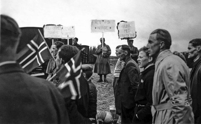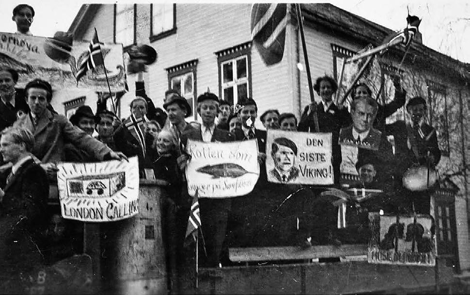 Fra fredsdagene i Mosjøen. Ungdommer har samlet seg med parodierende plakater i forbindelse med arrestasjoner av innbyggere mistenkt for landssvik. Foto: ukjent / Helgeland Museum.