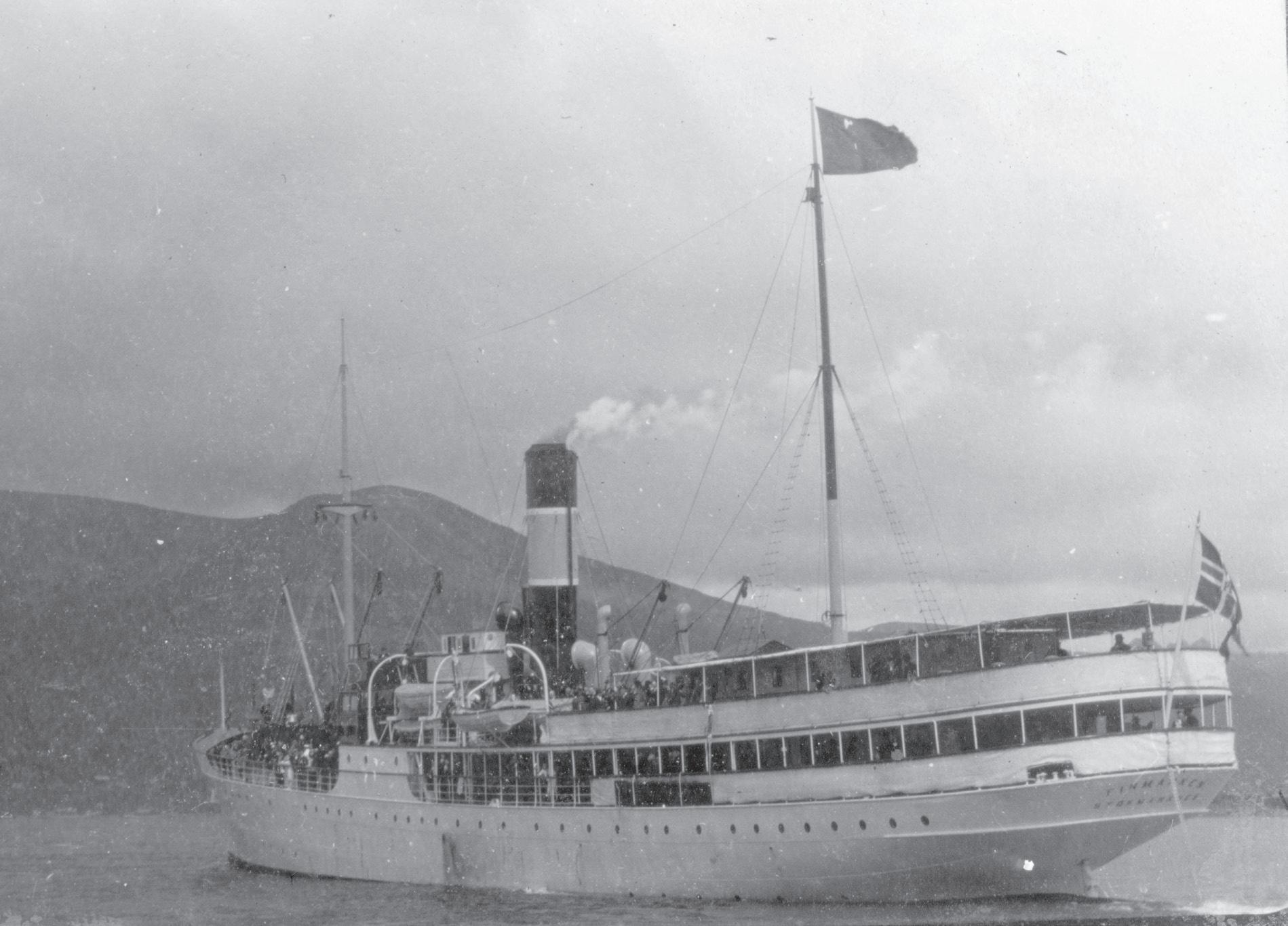 DS «Finmarken» stevner mot sperringsbåndet under åpningen av Risøyrenna i 1922.