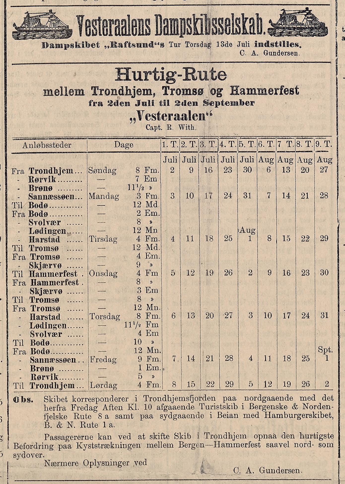 Det er tidlig søndag morgen, og passasjerene på nattoget fra Kristiania gnir søvnen ut av øynene. De er på en historisk reise som ennå ikke riktig har begynt. De skal rekke den første hurtigruta fra Trondheim. Det er over midtsommer; sola står høyt på himmelen over Persaunet, og nede ved Brattøra danser gjenskinnet av bølgekrusningene på ei hvit skuteside. Dampskipet «Vesteraalen» er pyntet til fest; alfabetet med sine 29 fargerike signalflagg er dandert oppetter baugstaget over mastetoppene og ned til hekken. Skipet har ligget for anker ute på reden siden det kom fra Bergen, og har i løpet av morgentimene lagt til ved den kunstige øya, Trondheims nye bydel. Det er den 2. juli 1893, klokken er snart halv ni, og fartøyet er klar til sin første avgang i fast ukentlig hurtigrute mellom Trondheim og Hammerfest. På brua står kapteinen. De tre stripene på jakkeermet avslører hans rang om bord. Sammenlignet med fyrbøterne er han formelt antrukket, men ikke mer: ulastelig, ikke prangende. Dobbeltspent vadmelsjakke, hvit skjorte, en nesten unnselig cachet med rederiets rosett. En bred veltrimmet bart under nesens påståelige profil, godmodige, men bestemte øyne. Hele mannens framtoning formidler en naturlig, vennlig autoritet. Denne solfylte morgenen i Trondheim opplever han høydepunktet i sin karriere. De siste årene har han bodd med familien i Bergen, men Trondheim er noe helt annet. Gudene vet for hvilken gang skal han til å legge ut fra byen som betyr så mye for hvem han er, og hva han vil. Den er hans andre hjem. Her vokste de opp, alle sammen: faren, farfaren, bestemødrene og oldefedre – slektsleddene får ikke plass på én hånd. Her fikk han sin endelige utdannelse, og her fant han kjærligheten. Selv er han nordfra, og dagens avgang skiller seg ut fra alle de han har gjort før.
