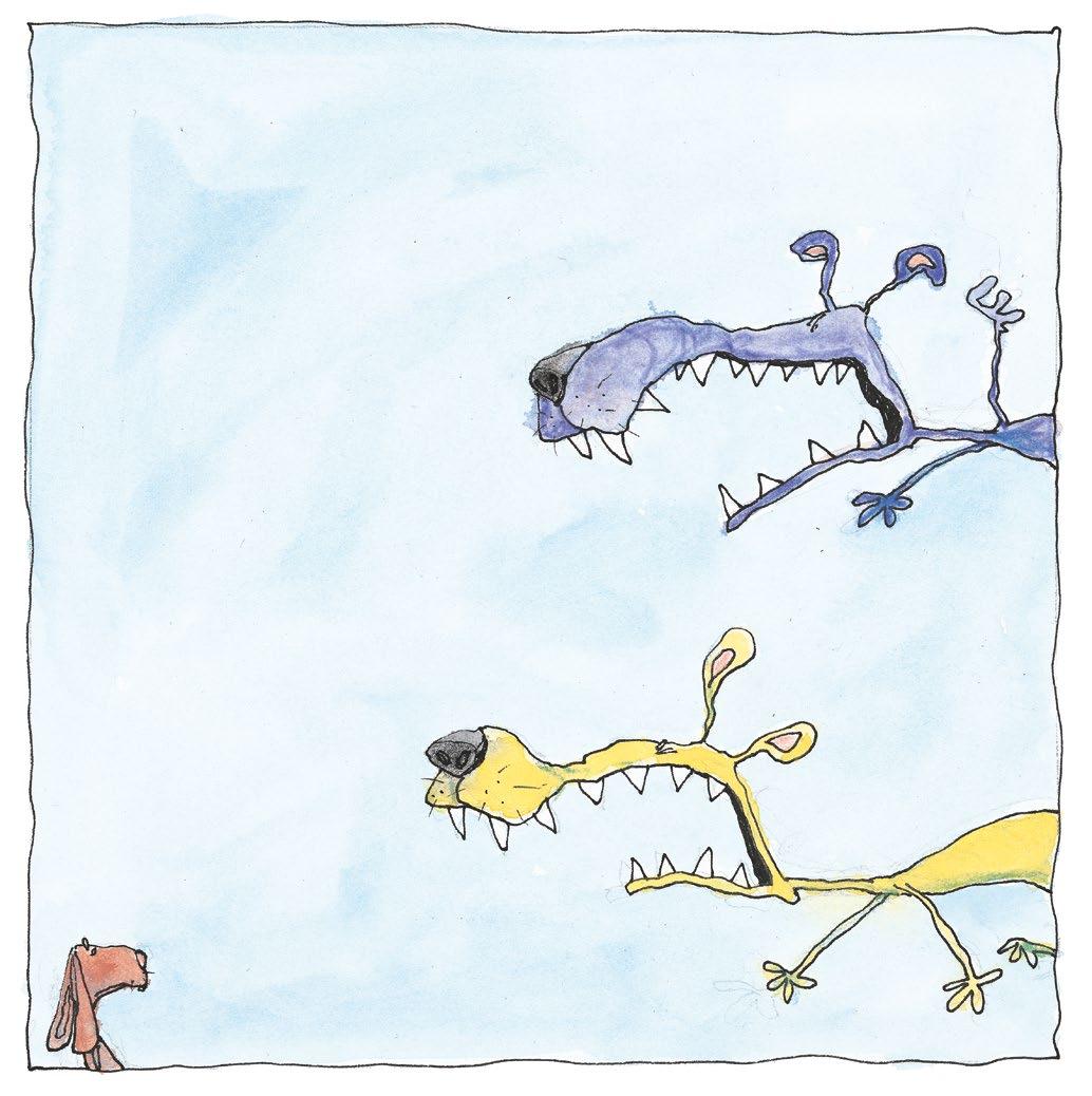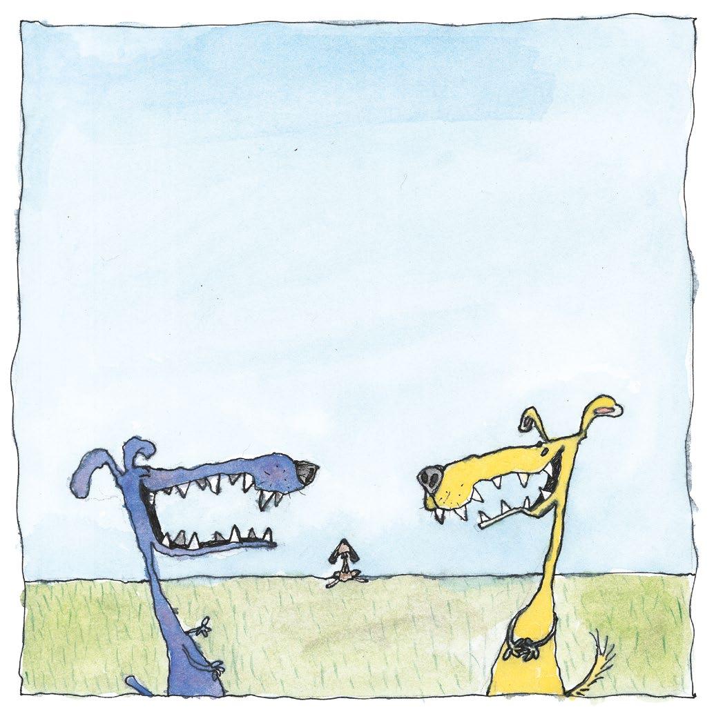To hunder står og flirer. Litt bortenfor står en kanin og holder vakt foran det gode gresset, der hundene pleier å tisse og skite. – At hun tør, sier den gule hunden. – Men nå blir hun slaktet, sier han og ler ondskapsfullt: – HA HA HA HAAA … Så angriper hundene.