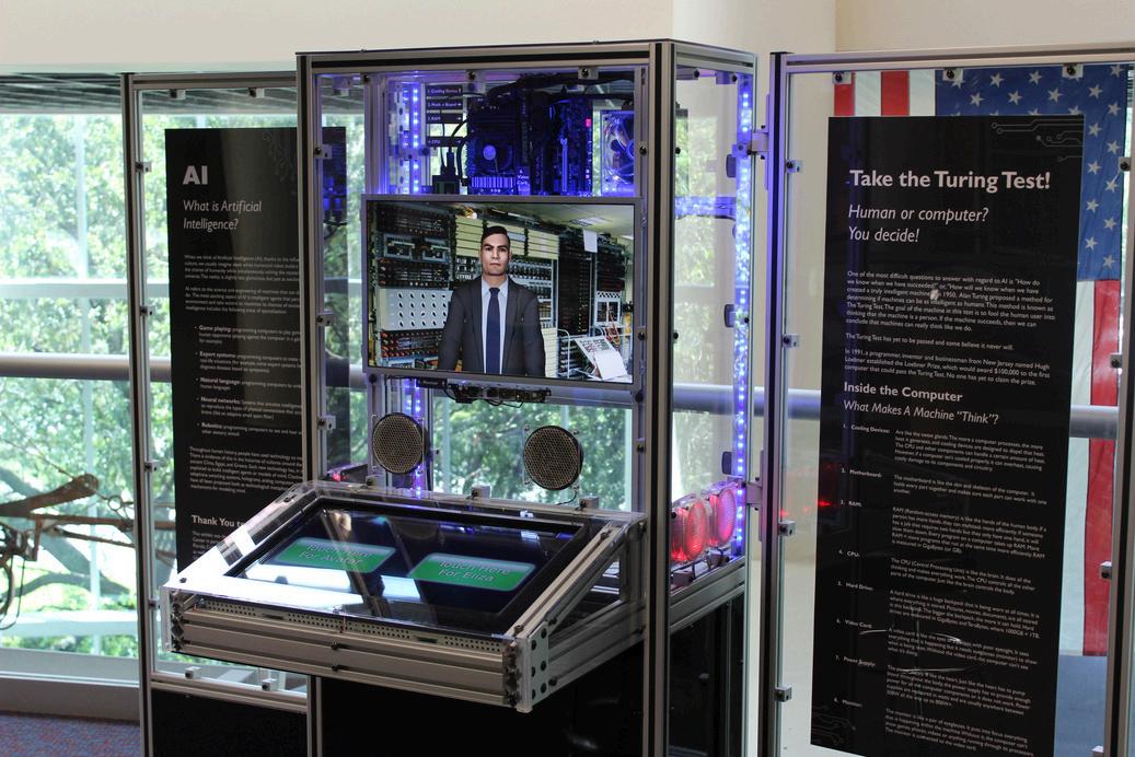 The exhibit allowed guests to ask an artificial intelligence machine questions to assess whether the machine was as self-aware as a human.