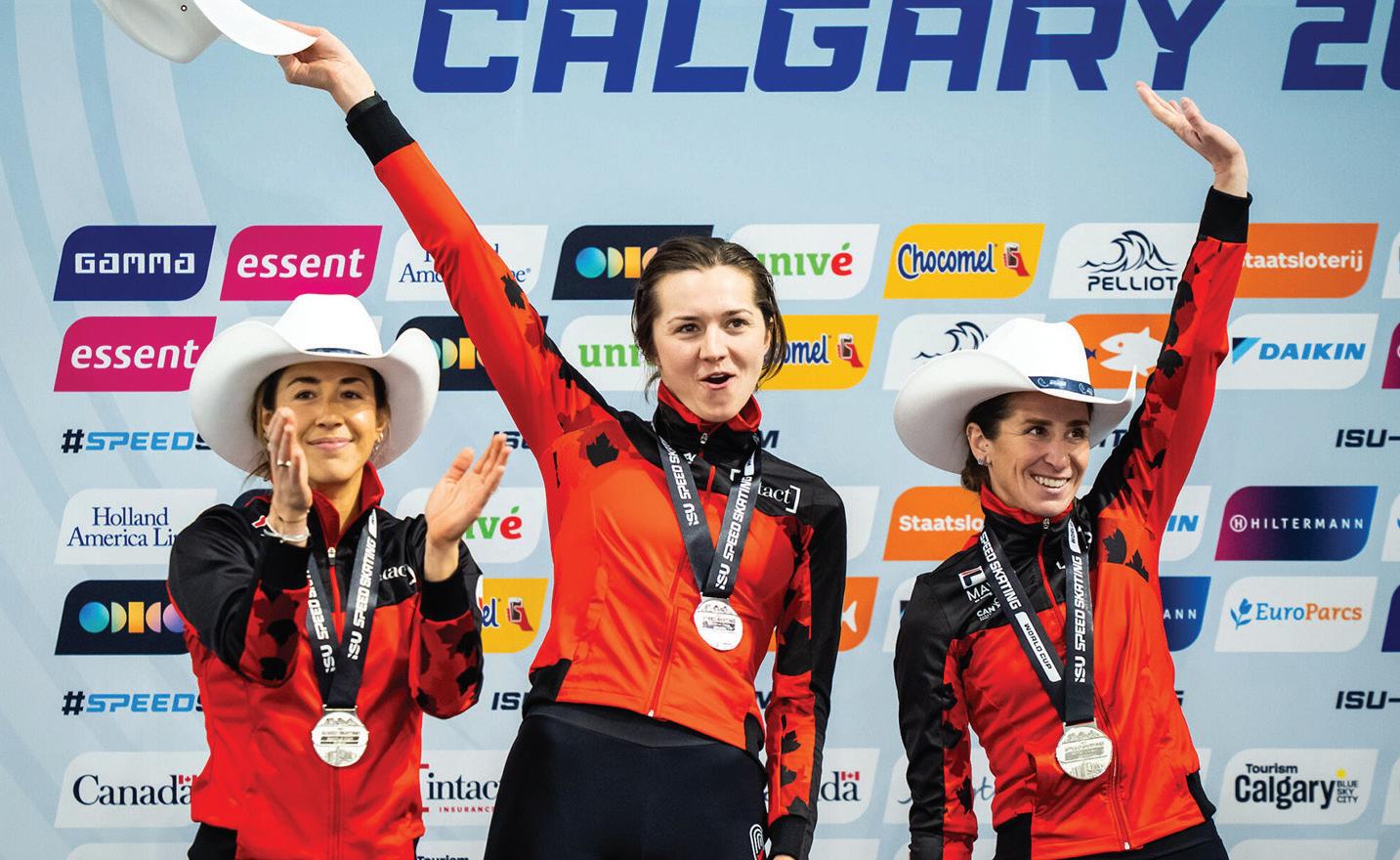 Isabelle Weidemann, centre, and Ivanie Blondin, right, with team pursuit teammate Valerie Maltais. CBC PHOTO