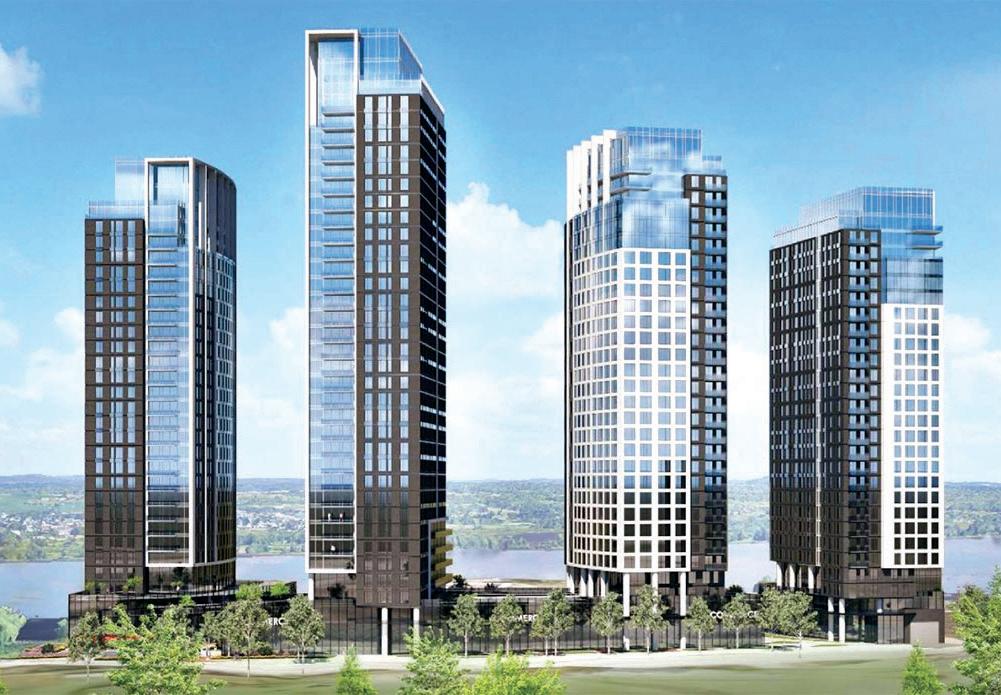 The four podium-style high-rise towers range from 24 to 32 storeys, containing 1,257 dwelling units, commercial businesses on the ground floor, a pedestrian plaza and underground parking. The dwelling units would consist 310 one-bedroom, 608 one-bedroom plus a den, 334 two-bedroom and five threebedroom units.