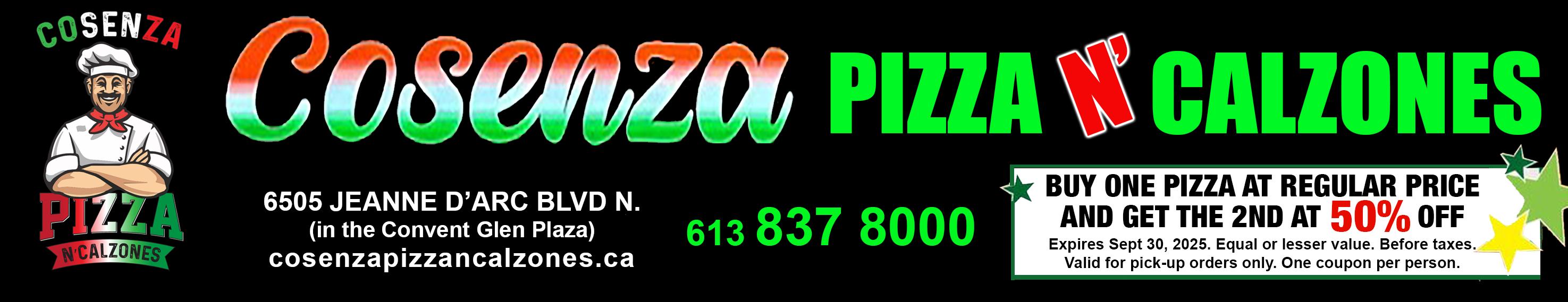 - Cosenza Pizza, 6505 Jeanne D’Arc Blvd. N.