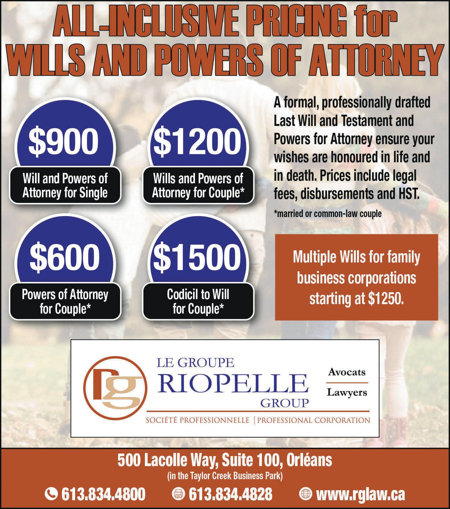 Whether buying or selling a business or dealing with difficult disputes or emotional matters such as divorce, custody or death, Riopelle Group can help. Call Riopelle Group at 613-834-4800 or visit their website at www.rglaw.ca.