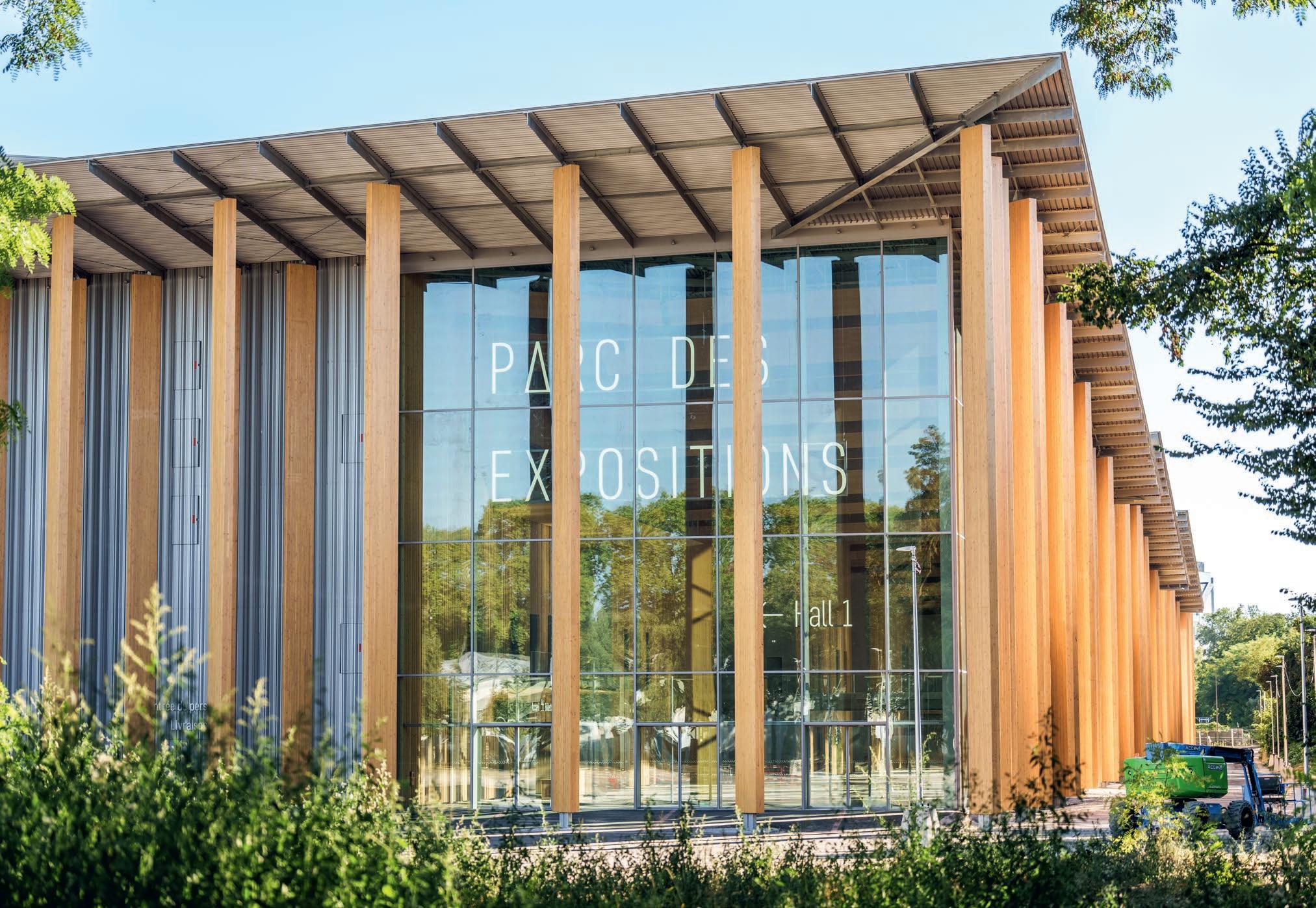 Situé à la lisière du canal de l’Aar, ce nouveau Parc des Expositions est aussi une ode à la nature. Il fait la part belle aux matériaux durables, comme le bois, utilisé sur 2 400 m3 de structure. « L’usage, structurel, du bois, constitue l’écriture du