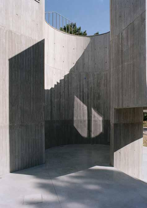 The structure is made of cast-in-place concrete and plays off the ambiguity of mass and void, and of inside and outside. It addresses the site by stepping the ground plane along its natural slope and by bringing that level difference inside. It is anchored into the ground firmly but irregularly around its perimeter vis-à-vis the terrain.