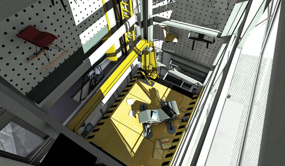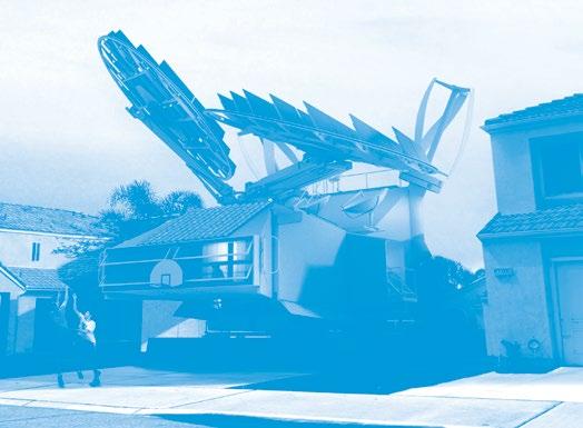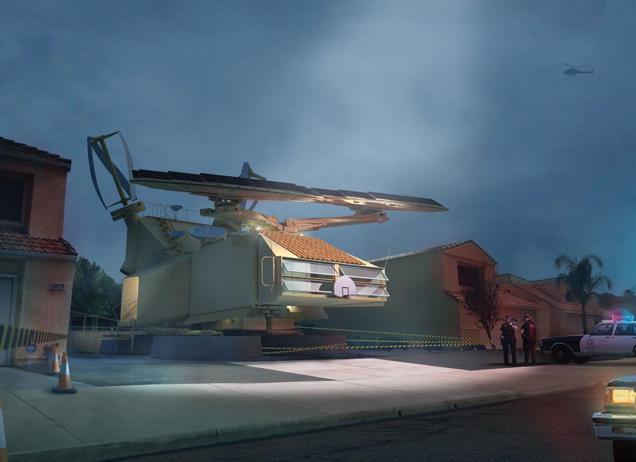 Although brimming with highly visible kinetic assemblies and devices, both inside and out, perhaps its most spectacular and compelling feature— beyond the aforementioned SRMS monumental articulated arm and its series of attachments—is the residence’s catapult-like retrieval and deployment armature for its occupants’ small electric vehicles. In the absence of any available driveway or service lane, this system is designed to catch and release the house’s assortment of elovs at freeway speeds. With precision timing, the Energy Absorption System platform-gondola swings down to meet the elov, traveling still at full speed, catching the elov and swinging it up out of traffic. The energy of the rapidly decelerating elov is transferred to the house via a flywheel and stored for future use. The system operates in reverse in order to launch the vehicles into traffic, using the stored energy captured during the retrieval in order to accelerate the elov to freeway speed.