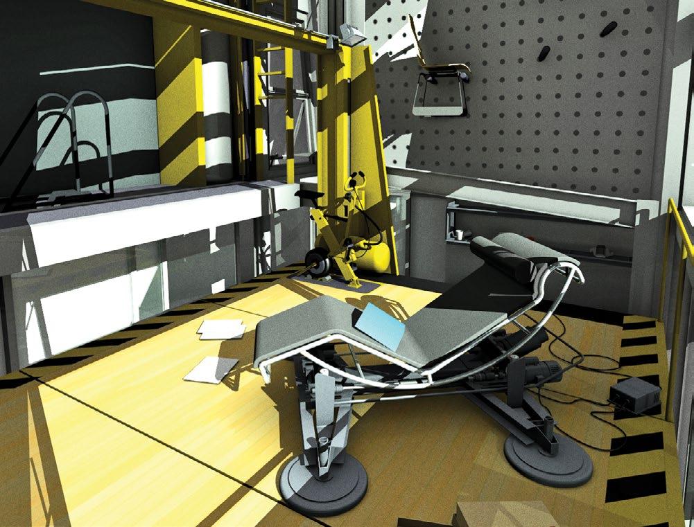 Also prominently visible on the exterior, the elevator is counterbalanced using a water storage tank, “pumped” via the fixed stationary exercise bike mounted to the corner of the platform. The foreground features Instrumental Form’s soupedup Chaise Lounge LC4 chair.