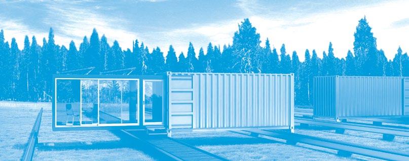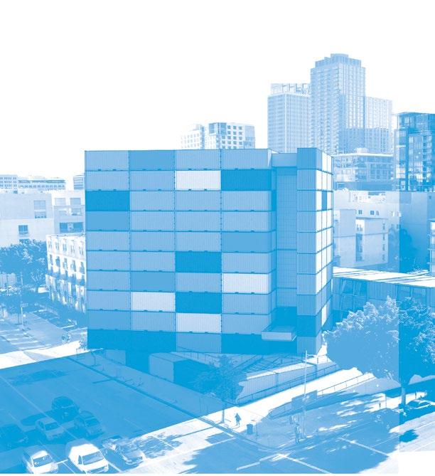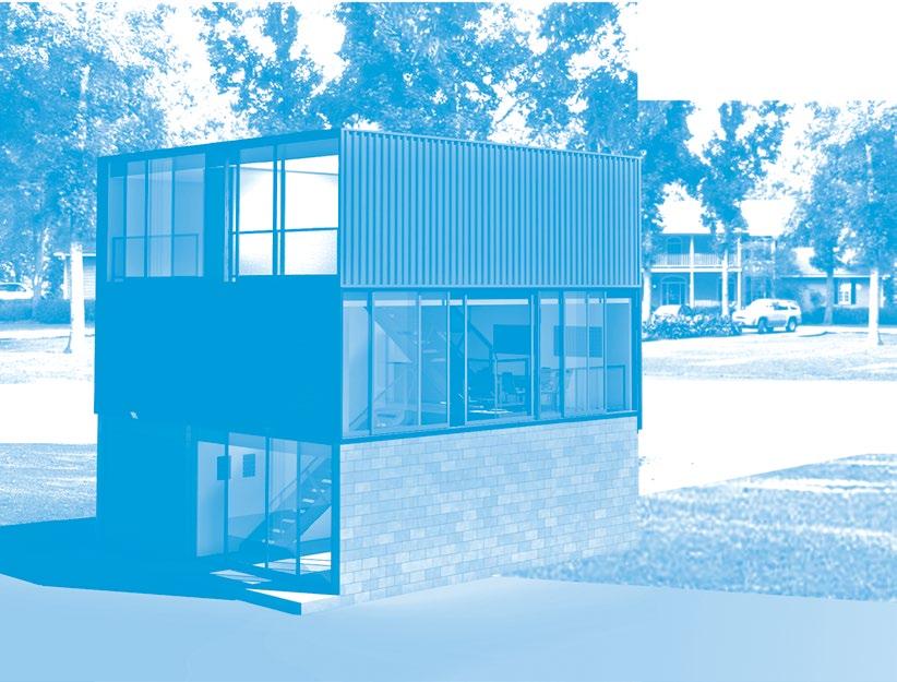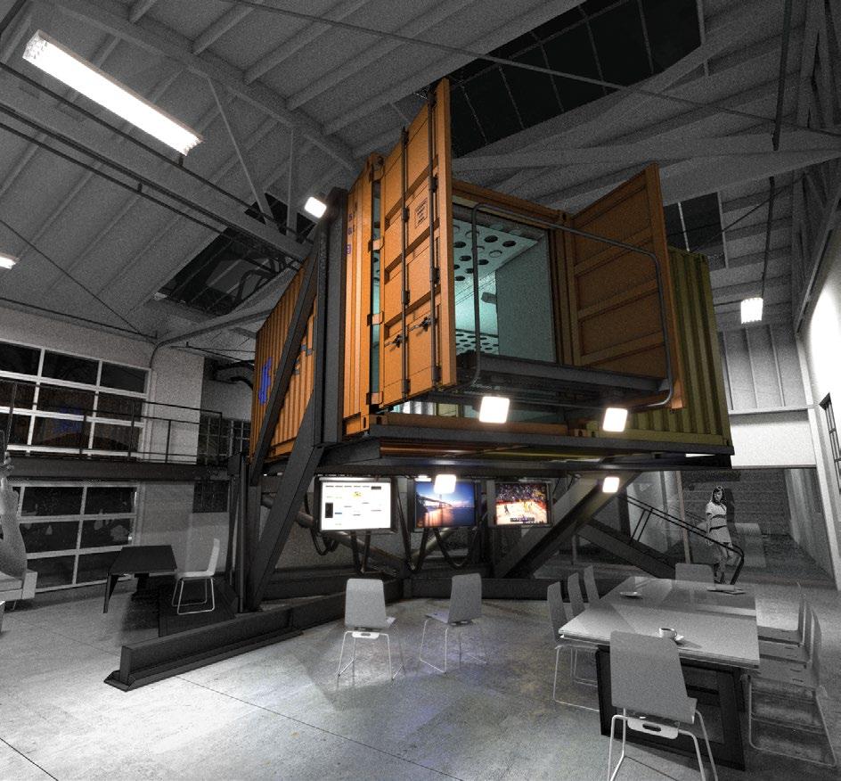 Materials + Systems New construction of Type V-B light gauge metal framing; acoustically isolating sliding glass wall system, “feature” office constructed from two 20’ ISO shipping containers on structural steel support dunnage