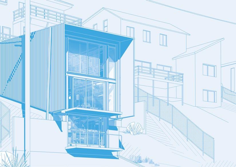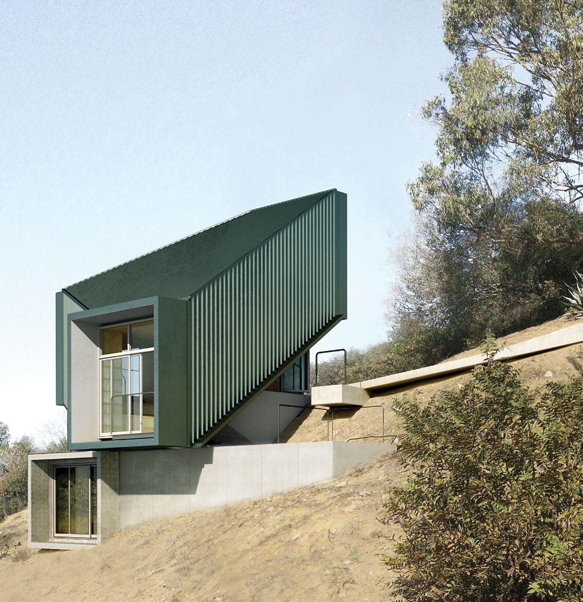 The owner has amassed a significant collection of historically important Modern furniture and will use the new studio to store and show his collection. Because there is a limited amount of space available on the lot in the vicinity of the mudslide for new construction, and also because of the City of Los Angeles’s parking policy regarding Hillside construction, it is desired that the footprint of the new studio be minimized. Consequently, the project is envisioned as a multilevel structure with a 600 sq. ft. footprint. A single level/ platform will translate vertically via an elevator mechanism through the volume of the tower, allowing it to access the furniture and books arranged on shelves running up the full height of the walls. In addition to this platform and the space through which it travels, the studio will include a kitchen and dining area, a bedroom area, and a single bathroom/shower space (as well as the shelving), bringing the entire assignable area to approximately 800 sq. ft. The new studio/library will itself be accessed separately from the existing house, via a new stair leading up to the street and new parking at the street level; the new stair will be designed in such a way that it may be used to transport/slide the owner’s collection up and down to the new studio. A target budget of $300,000 has been established for this project. The owner intends to use the contractor presently engaged in the hillside repair and underpinning of the existing building to construct the new building. It is anticipated that the contractor will be involved in value engineering the project during design and documentation phases.