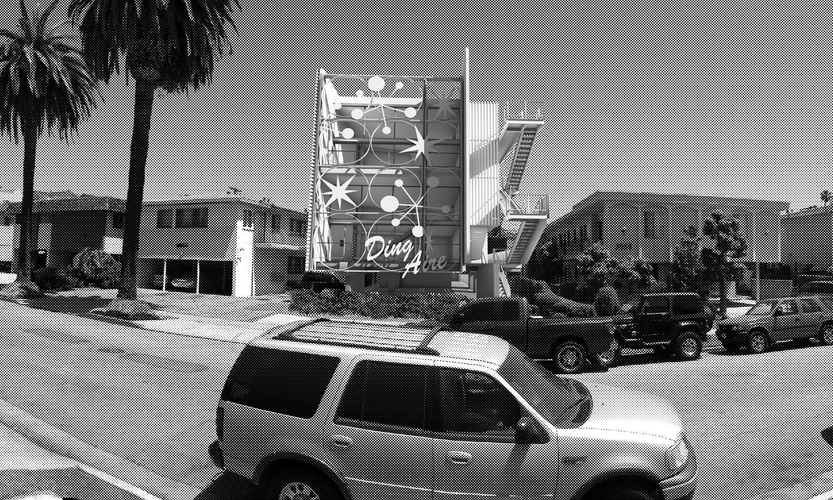 The primary form driver of the dingbat is the parking arrangement—how it penetrates directly from the street to the interior of the site, pinning the dingbat between the street and the alley, with the pedestrian circulation strung between