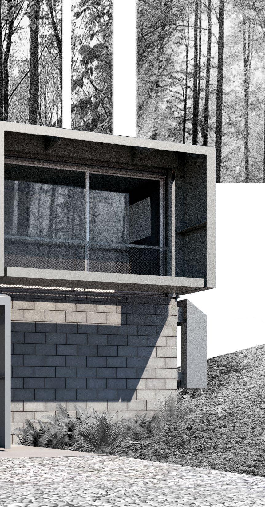 Materials + Systems Reinforced masonry and concrete foundation incorporating basement and lower levels, wood-framed prefab. envelope wall construction with corrugated metal panels, thermal sliding-door glazing systems, miscellaneous steel detailing