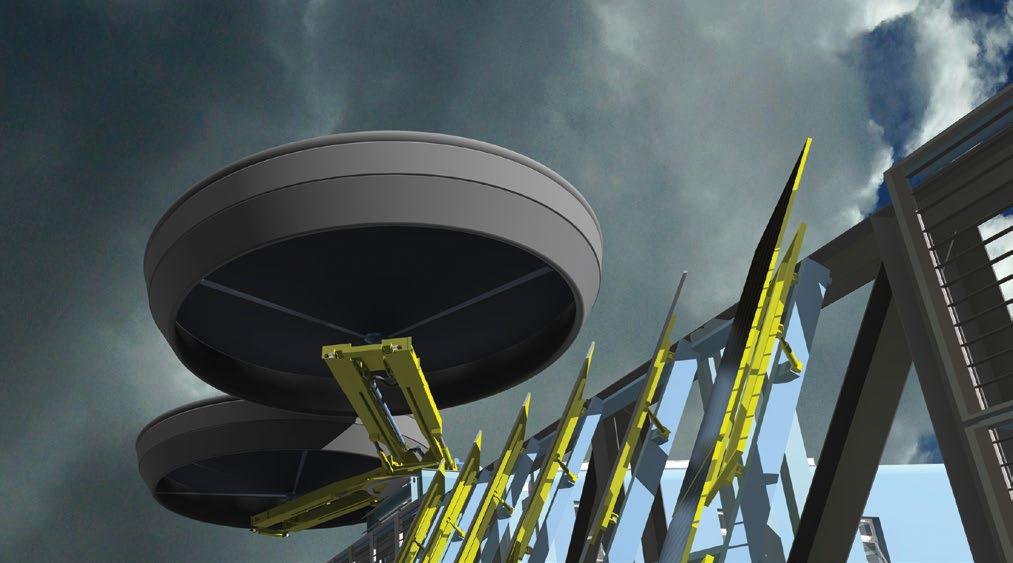 Detail view showing one configuration of end effector attachments (inflatable water collection bowls), along with the adaptive freeway signage solar panels and a windbelt-type generator panel
