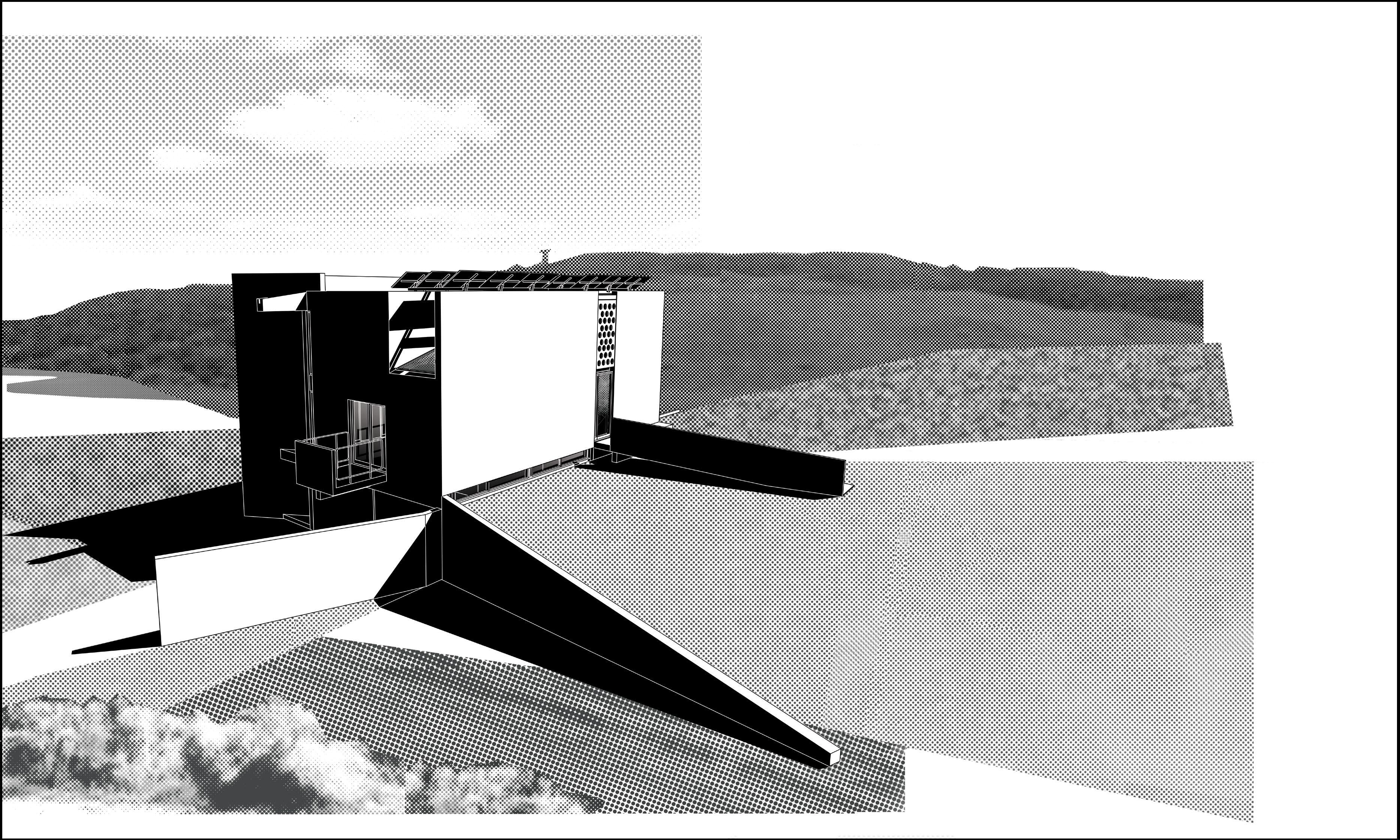 The plan at the level of occupation—approximately set at the height of the freeway signage—shows the dwelling nestled between the two elov launch and retrieval mechanisms, aka catapults