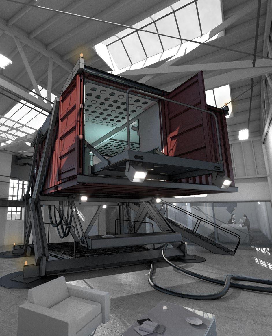 the container units would not actually raise and lower, the suggestion of that possibility helps organize the space and set the tone