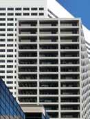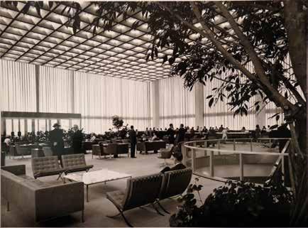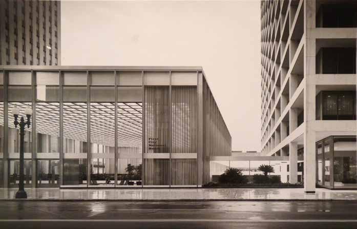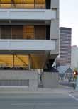 placed on McKinney Street, and, to the tower, on Lamar Street. Road and service accesses were placed on Fannin Street. The banking office portion was occupied by six drive-through booths where customers did not get out of their vehicles. The façade of the office tower on this street is already destined for a dock and service entrance. Regarding the tower, it is interesting to note the way it was integrated into the surrounding sidewalks. The columns are at the edge of the building and reache the ground. All the enclosures, mostly glazed, were set back from the columns, creating a loggia-like gallery next to the public space. The height of the columns also contributed to the effective configuration of a gallery: while on the standard floors the clear height between the perimeter beams is 9’ 6” (2.91 m), while on the first floor