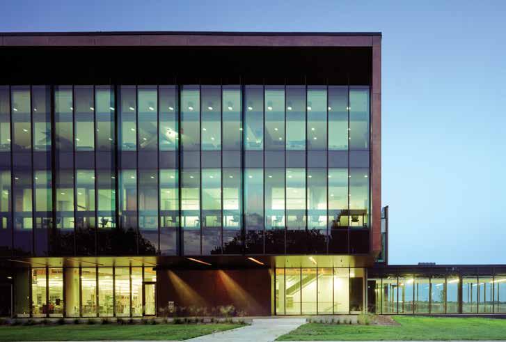 campus landscape. The landscape would be defined by a circuit of academic buildings facing the campus ring road and the wooded floodplain of the Credit River beyond. With the Instructional Centre, we established a DNA of public space typologies that would provide desperately needed space for social and academic exchange while knitting the expansion into the existing landscape and building fabric. We conceived of a chain of interior public space that would encircle and overlook the new green—a highly transparent architecture at the ground and second floors, punctuated with student amenities. Oriented perpendicular to this chain would be “learning agorae” that connect visually and spatially with the ring road and the forest beyond. The agorae share core guiding principles as theatres of public life on campus, but their realization over a decade, the diverse contexts they address, and the variety of programs they support have resulted in distinct architectural environments.