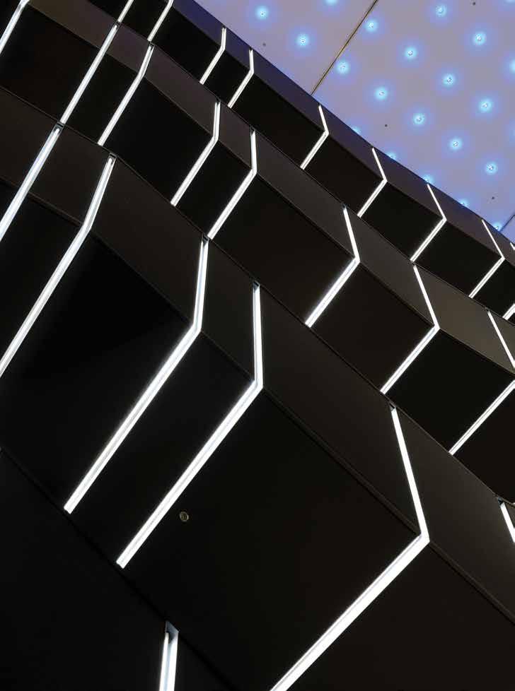 At Maanjiwe nendamowinan, the theatrical potential of the space hearkens back to the Piazza di Sant’Ignazio in Rome, with its multiple entrances drawing people onstage or to become spectators through a set of constantly shifting personal and spatial identities. The potential in this case centres on the building’s North Hall—a tiered, divisible space that serves as the social and organizational heart of the building day-to-day and that transforms to support structured events as needed. Amphitheatre seating negotiates the sloping site, connecting the ring road entrance to the campus green, and provides opportunities for casual gatherings and study as well as spectator seating for major occasions such as convocation or student award presentations. A set of threestorey-tall, pivoting partitions marks the threshold between stage and audience, provides a surface for film projections, and allows multiple events to occur simultaneously. Bridges and suspended stairs crisscross the lofty space, linking the two academic blocks and providing opportunities for people to look and interact.