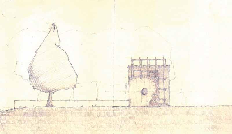 and encrusted patina, in fire and in ash, in secret springs as well as manholes and finally, lightning rods. The insistent horizons of the floor and roof planes contrast with the oblique section of the site as dynamic ground. The copper shield is an unrelenting ruler with the character of a fine-tooth comb. The Volcano is also a tent encamped once again upon the site. The hearth is a grotto, the outrigger ark beneath the kaleidoscopic box, which merely frames the sun and the moon. Parcel X is an apology for the temporary encampment of those in search of a New World Arcadia, where the steel frame audibly creaks in the wind, the concrete displays stress cracks seasonally, and the rain shield does not leak (too much).