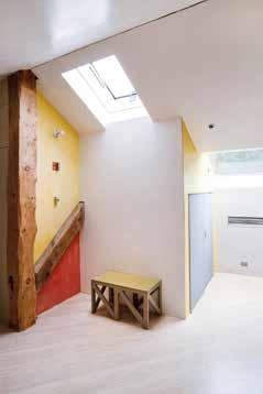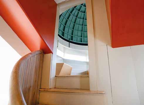 David quickly turns Peter 90 degrees now toward the interior stair hall and points to a light well which rises to a rooftop skylight, which does not leak too much.