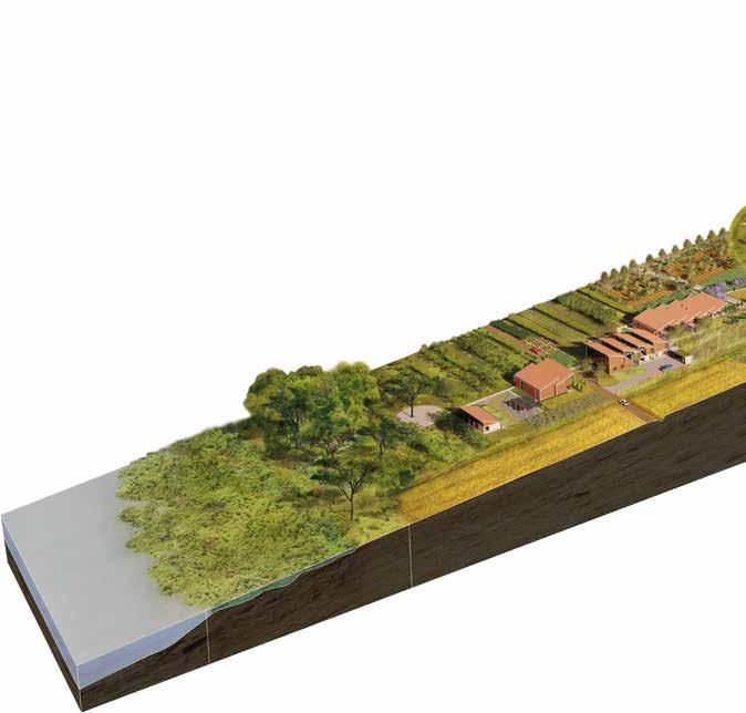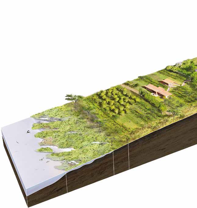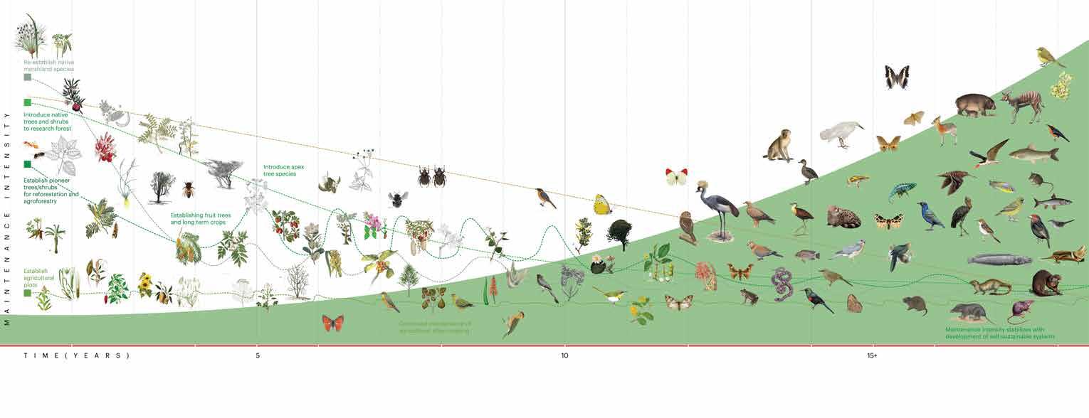 The intentional design of integrated ecological and agricultural systems within the campus promises to enhance productivity of crop output and the presence of biodiversity. This is achieved through four scales of ecosystem design that complement each other in function. These scales of ecosystem include agroforestry creating a layered agricultural planting system, marshland restoration along the lake edge, re-introduced native savannah woodland species, and the establishment of agricultural crops. While these interventions require maintenance for initial stabilization, once established their increased diversity begins to self-regulate, compounding benefits until an established ecosystem evolves. At this stage, maintenance transitions into stewardship and the impacts of a flourishing habitat can be seen through increased crop production, enhanced resilience to pests and disease, improved water and soil conditions, and human health and well-being.