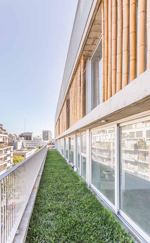 Sliding glass doors and a generously sized balcony creates a seamless indoor-outdoor relationship. The bamboo screen on the façade works both as a shading device and also adds a natural texture to the site's immediate urban environment. This double layered façade consists of a bamboo screen and glass façade. The layered façade allows both residents and pedestrians to have a semi-porous view out of and into the building.1
