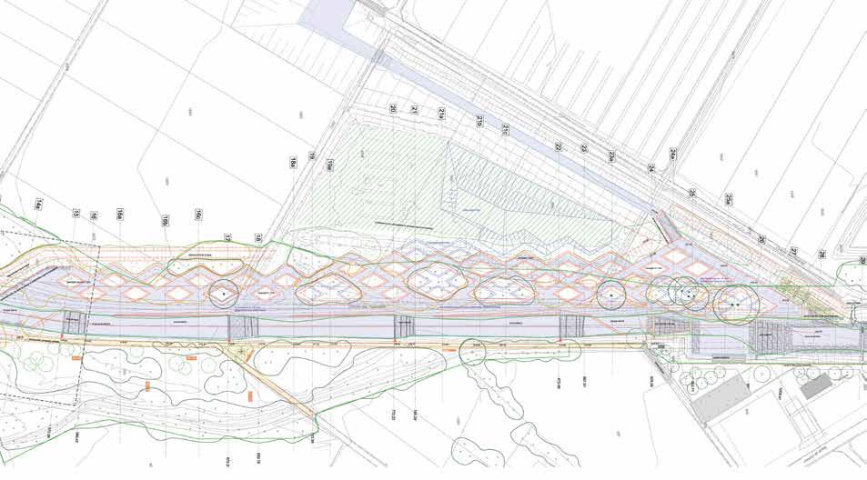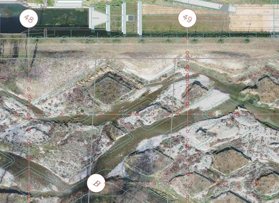 SUPERPOSITIONS. Renaturalization of the River Aire. Geneva, Switzerland, 2000–2021+. Engineering plan showing the lozenge field in relation to the surrounding landscape. [SUPERPOSITIONS]