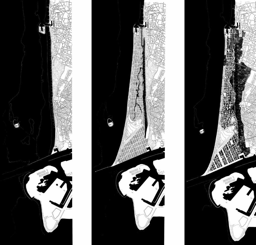(opposite above left) 3-6 West 8. Buckthorn City and the Dune Apocalypse. Buckthorn City master plan with three successive phases: existing, buckthorn plantation, and urbanity. [West 8]
