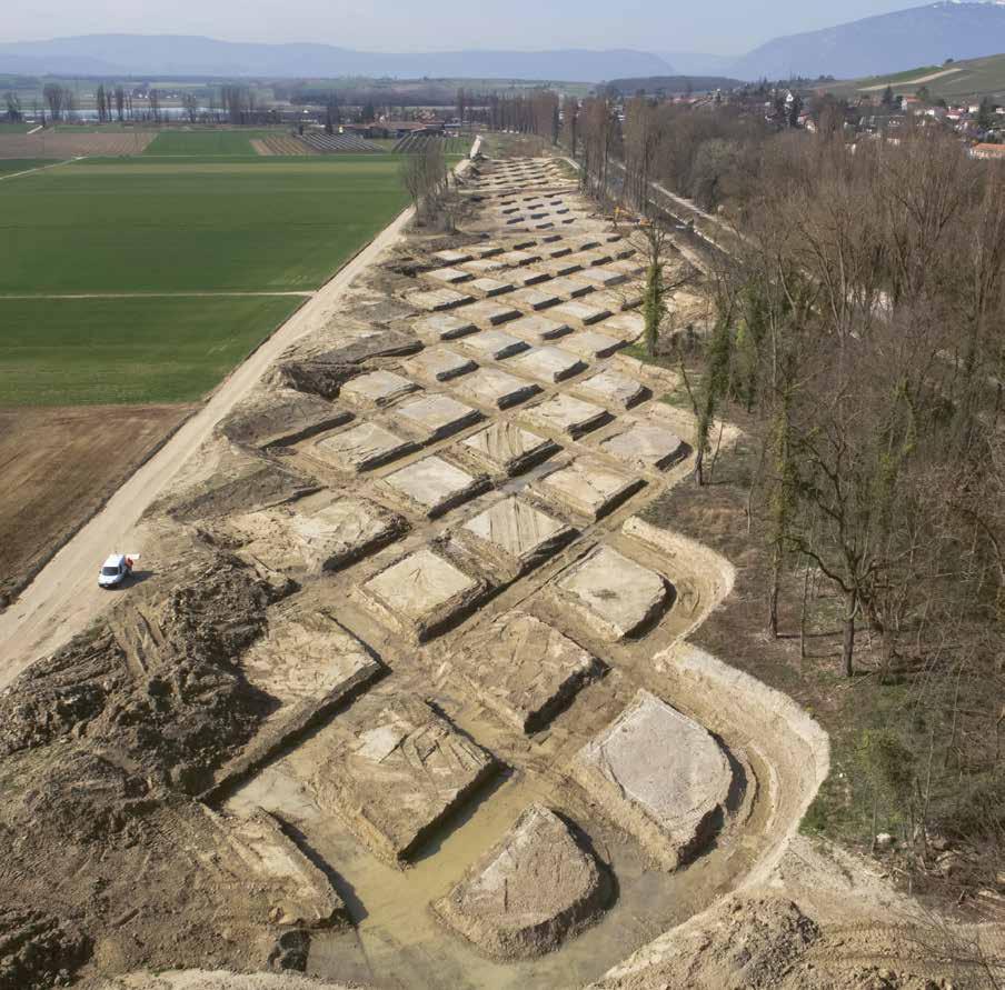 SUPERPOSITIONS. Renaturalization of the River Aire. Geneva, Switzerland, 2000–2021+. The completed lozenge field excavated from the riverbed. [Aerial Works Fabio Chironi]