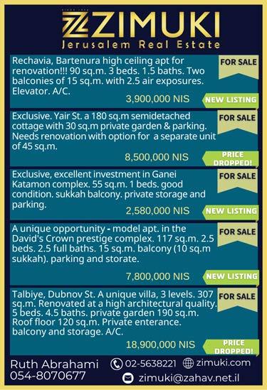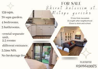 Most Recent Listings in Jerusalem Yitzchak Kowalsky 054-766-0338 Yitzchak@yykrealestate.com www.yykrealestate.com Great Opportunity in Rechavia 2 bedroom Garden Apartment 65 sqm Rare & quiet Full of potential! Immediate occupation! Private land! 3 bedroom 2 full baths Upgraded apt including: Floor heating Central A/C Balcony (not Succa) Fully furnished with appliances! Shabbat elevator Parking & storage Available: immediately! !חמש םירוא גח New Project on Mekor Haim Street Penthouse: 147 sqm +114 sqm terrace Large 5 Bdrms + 13 sqm balcony High end specs Great prices and payment plans