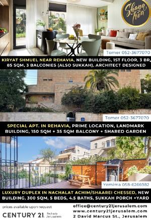 * Katamon - 4 rooms, 140m, 2.5 baths, elevator, Succa balcony, available from November. 15000nis