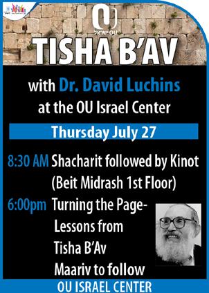 The Fast of Tisha Be'Av begins at sundown on Wednesday July 26, 7:45pm and concludes on Thursday at 8:09pm (Jerusalem time)