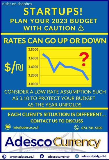 OU ISRAEL CENTER 5 True wholesaler from the diamond boursa with over 25 years experience member diamond dealers club Engagement Rings ∙ Stud Earrings Pendants ∙ Tennis Bracelets 050-573-9061 jeffmor36@gmail.com www.JeffMorDiamondJewelry.com kerenmalki.org 02-567-0602 Keren Malki empowers families of children with special needs in Israel to choose home care. Donations are tax-approved in Israel, US and UK. Honoring the memory of Malka Chana Roth ד”יה 1985-2001, killed in the Sbarro bombing. OU ISRAEL CENTER 7 people means me. is when what those purpose next very the heard. the to accept his is the G-d, his humility. people oppoastell My MarSea Modest Swim & Casualwear www.MarSeaModest.net (NIS) www.MarSeaModest.com ($USD) Marci Rapp 050-424-8359 JLEM 02-628-8282 I TLV 03-720-8000 tzviair.com THE AND INSTALLATION CONDITIONING JUST ASK ANY OF OUR THOUSANDS OF HAPPY CLIENTS. davidz@AshkelonProperties.com LIVE OPPOSITE THE SEA 0544-332621 said another happy client Owning your own apartment does not just allow you freedom, but offers monetary savings, and an increase in your investment value. Anglo-populated, sunny Ashkelon is the answer! It’s very affordable – from $500,000 with just a 15% down payment, mortgages available as well as bank guarantees. Rental income often in excess of 3.5%. Ilana Nelson 054.5341403 www.integrityrealestate.co.il FOR RENT LOVELY, BRIGHT 3 RM APT #4 TCHERNICHOVSKY ST 85 M, WHEELCHAIR ACCESSIBLE FURNISHED WITH APPLIANCES 3RD FLOOR WITH ELEVATOR 6500 NIS