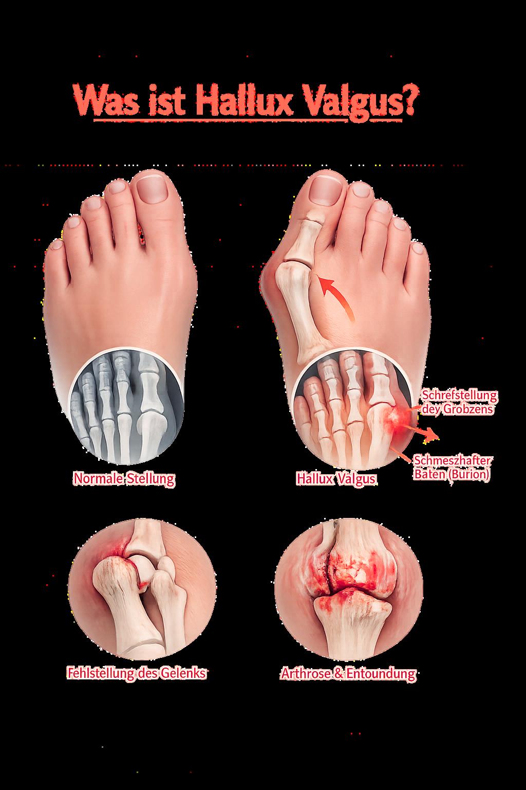 oft ein sichtbarer Knochenvorsprung, der Schmerzen, Schwellungen und Probleme beim Gehen verursachen kann. Die Fehlstellung entwickelt sich meist langsam und betrifft vor allem Erwachsene, besonders Frauen.