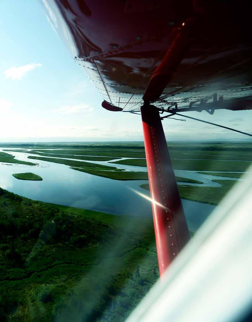 While a mere 70-minute commercial flight from Anchorage, it’s here in the vil lage of Aniak that everything changes. A 75-minute jet boat run puts you on the banks at our river glamp (glamour camp), and another 45 minutes lands you at the remote trout camp. Our river meanders and winds through gravel bars, log jams, and sandbanks as it makes its way through riparian forest and tundra. Apart from the occasional rafter, we are alone. One hundred miles of water is yours. Seven boats and seven guides to make your trip perfect. No planes, no people, no combat fishing here. We fish 12 plus species, including all five salmon, and specialize in mousing for aggressive rainbows. We are one of only three river systems in North America that holds the elusive sheefish.