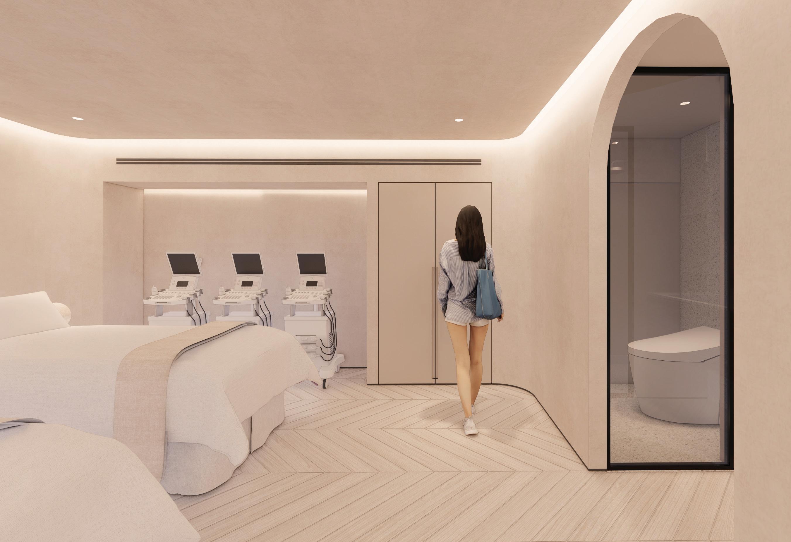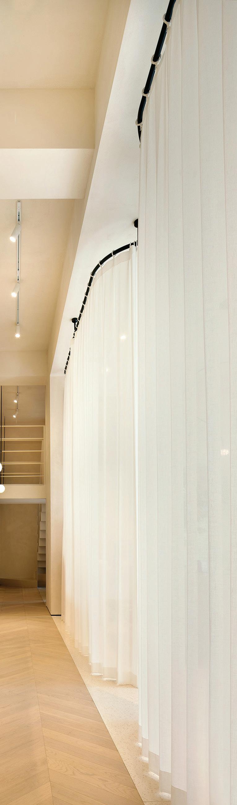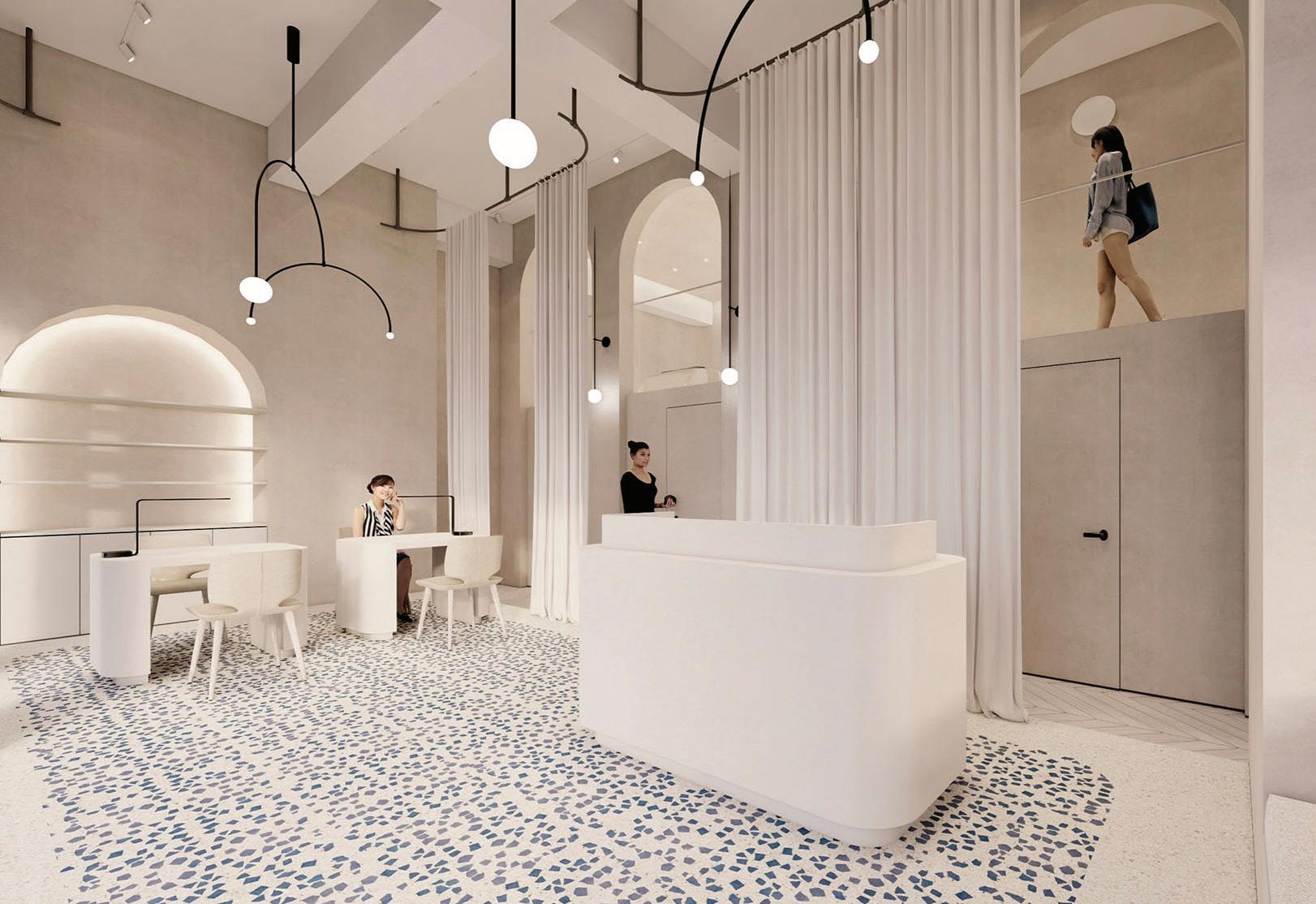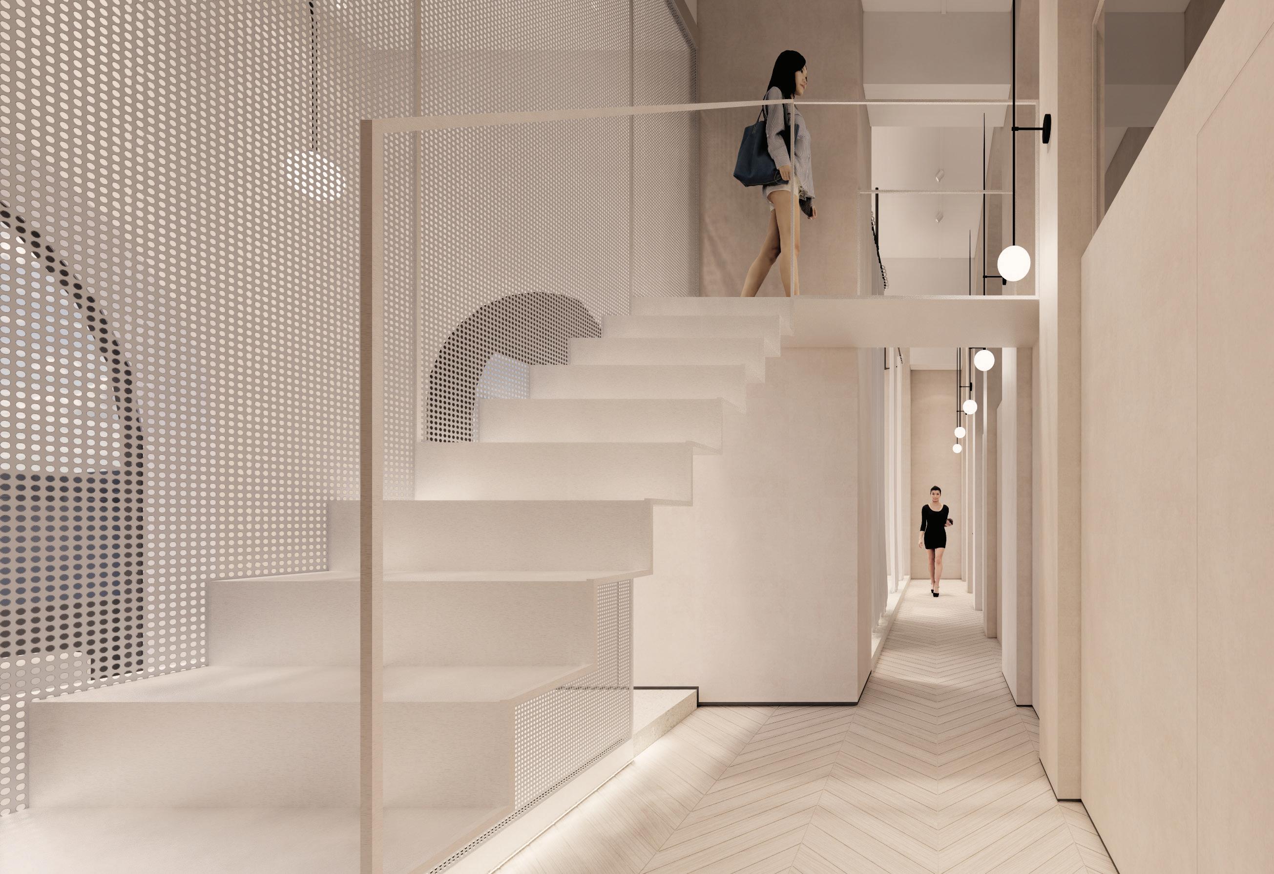 Colores y materiales naturales (beige nude), formas redondeadas, luz reflejada e indirecta, la sensación de un espacio limpio, luminoso y bien organizado - estos fueron los objetivos estéticos de este proyecto. “Duo Workshop” es un salón de belleza ubicado en uno de los distritos más concurridos de Shanghái. Ofrece un espacio armónico para cada cliente que busca tratamientos profesionales, pero también relajación y un descanso sensorial. Para maximizar el uso del espacio, lo dividimos en dos bloques funcionales: 1. un vestíbulo alto con recepción, sala de espera y estaciones para tratamientos sencillos, 2. una entreplanta de dos niveles con individuales salas de tratamiento, situada en la parte trasera. Esta división se enfatizó con una característica secuencia de arcos. Los arcos y formas redondeadas también se repitieron en otros elementos del mobiliario y en la fachada acristalada del local, creando una composición armónica.
