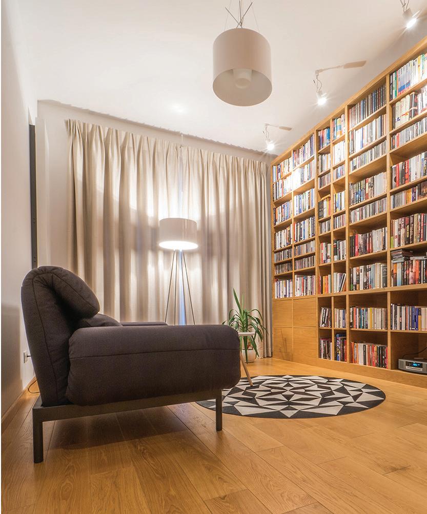 La cocina, muy compacta pero completamente funcional, fue diseñada como un elemento integral del salón, ya que el propietario rara vez planeaba cocinar en casa. Mi cliente era un fan de Philippe Starck, por lo que elegí muchos elementos diseñados por este diseñador (como grifos, lámparas, etc.). Otro de sus sueños hechos realidad fue la biblioteca en la habitación de invitados, que albergaba una extensa colección de libros y CDs.
