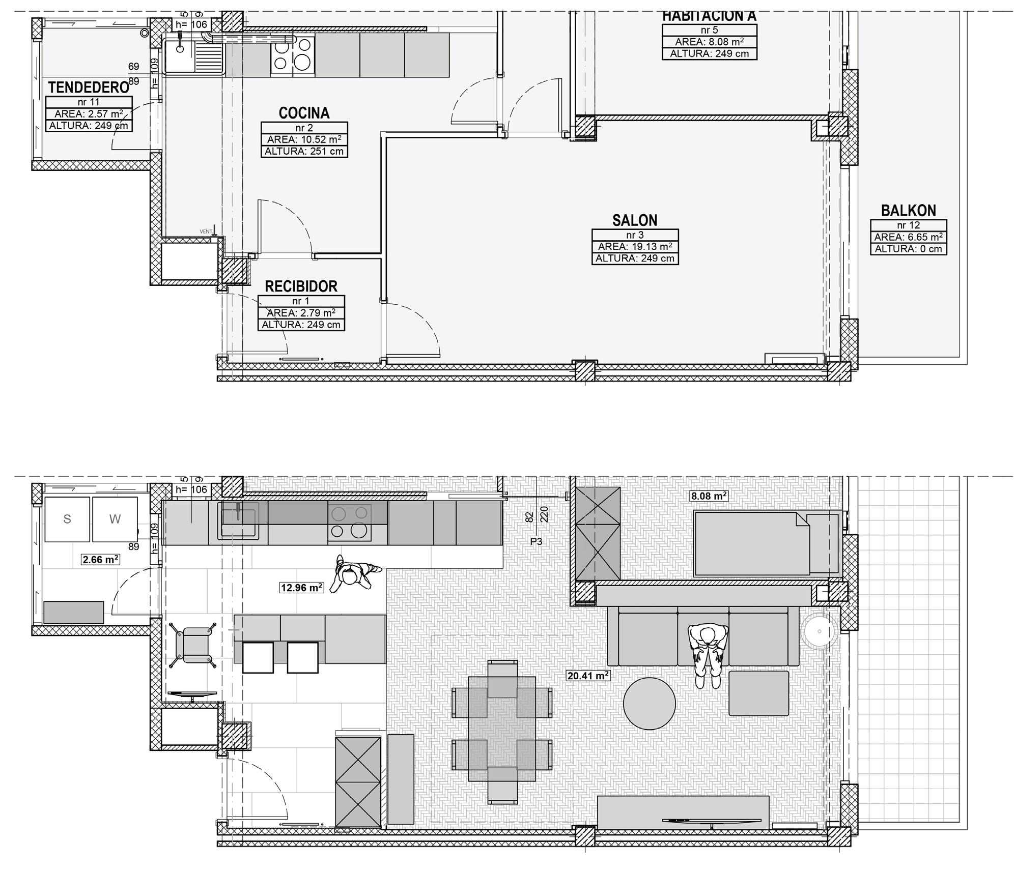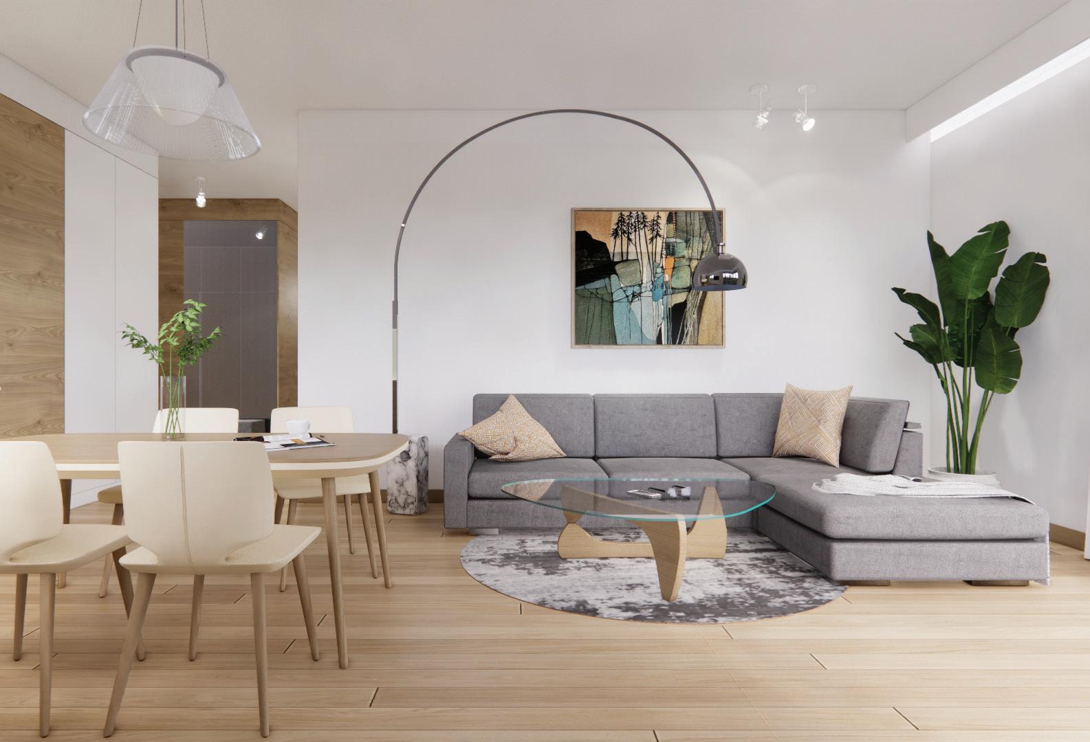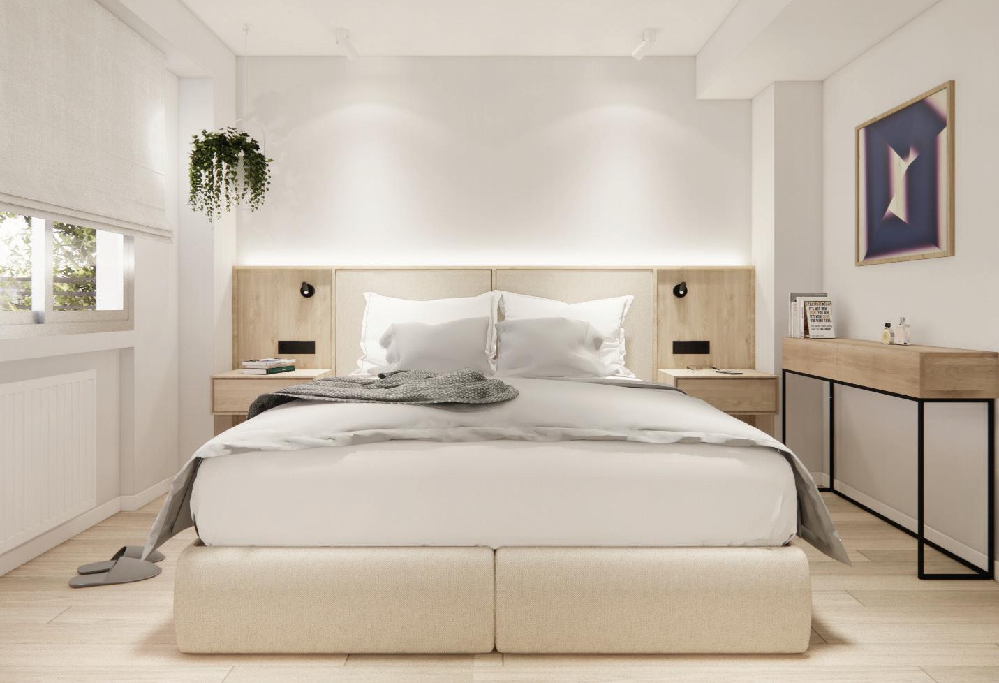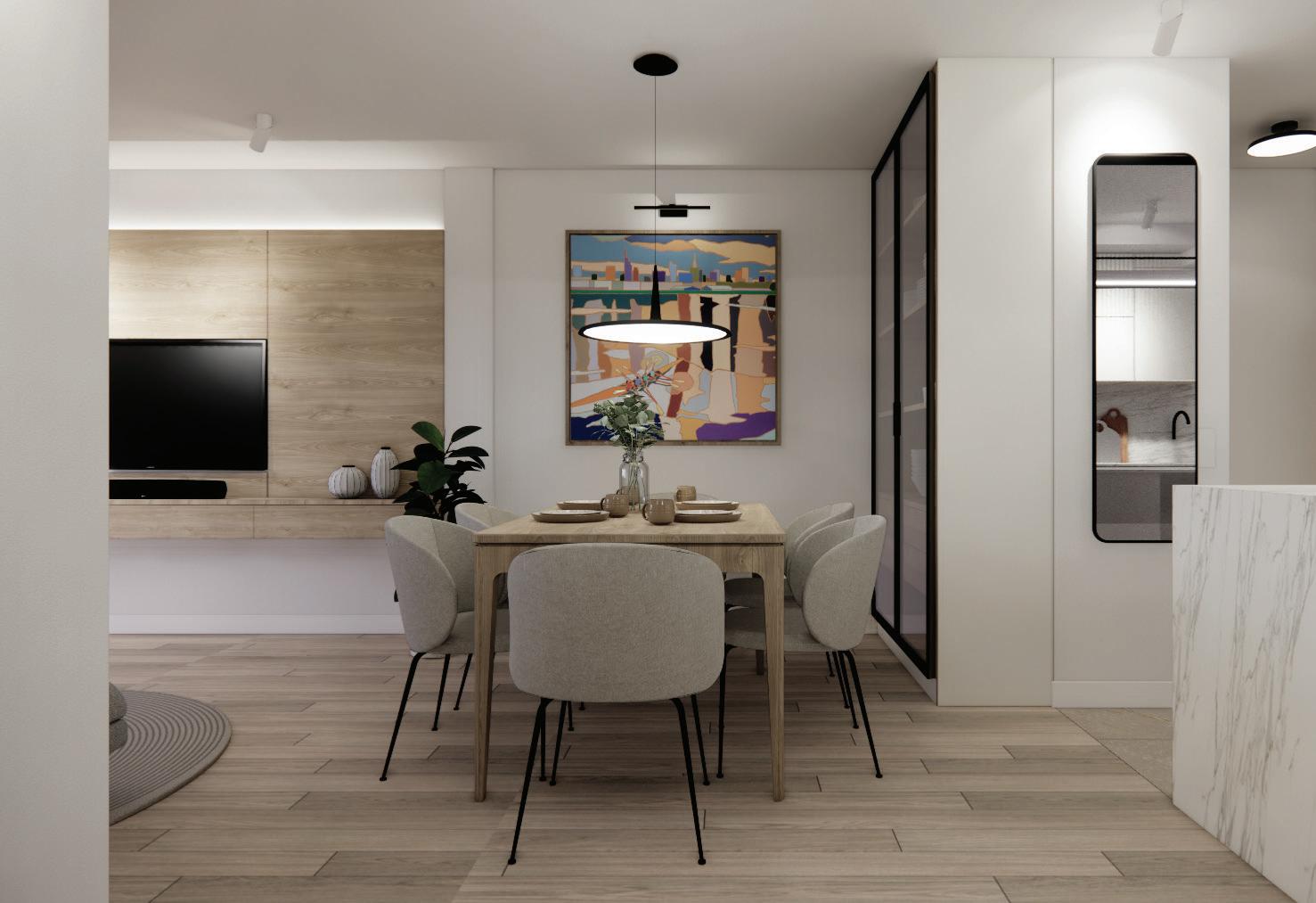 El apartamento con una superficie de 90 m2 constaba de cocina, baño, salón, 4 dormitorios y 2 baños, lo que hacía que cada una de estas estancias fuera muy compacta y había que aprovechar bien cada m2. Para aportar espacio y luminosidad a la zona de estar, combinamos la zona de entrada, la cocina y el salón. Gracias a la reducción de los pasillos, incluso hubo espacio para una isla de cocina. Funcionalmente, la zona de noche no requirió muchos cambios, pero estéticamente hubo que renovarla completamente, Los propietarios del apartamento eligieron una paleta neutra de beige y gris combinada con detalles en negro, introduciendo un contraste discreto en cada espacio. Otro tema importante fue el uso de materiales ecológicos y muebles de marcas locales.