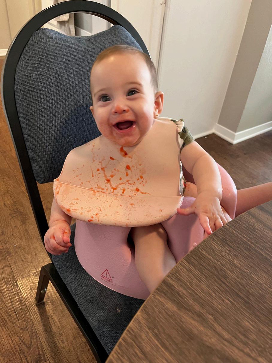 Em agosto também iniciamos sua introdução alimentar, o que tem sido um desafio para todos nós. Para o Vini, a quebra de expectativas: ele achava que a Serena iria comer bem desde a primeira vez Para mim, o desafio é não me frustrar quando ela só quer brincar com a comida sem provar nada Mas, aos poucos, ela tem evoluído muito bem Até agora, suas frutas favoritas são morango e tangerina