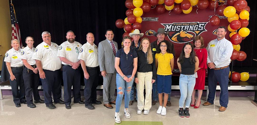 District 56, to announce an opportunity to the Middle School Civic’s students on his House Bill 865 AED that passed. St. Cloud Fire Chief Jason Miller was on hand with a special announcement on CPR Training.