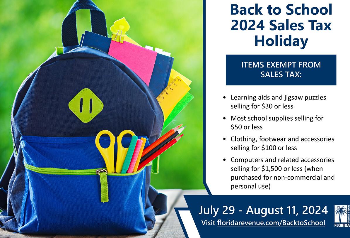 Tallahassee, FL - Back-to-School Sales Tax Holiday, which began on Monday, July 29, and runs for two weeks ending on Sunday, August 11, will allow families to save money on items their students need for the new school year.