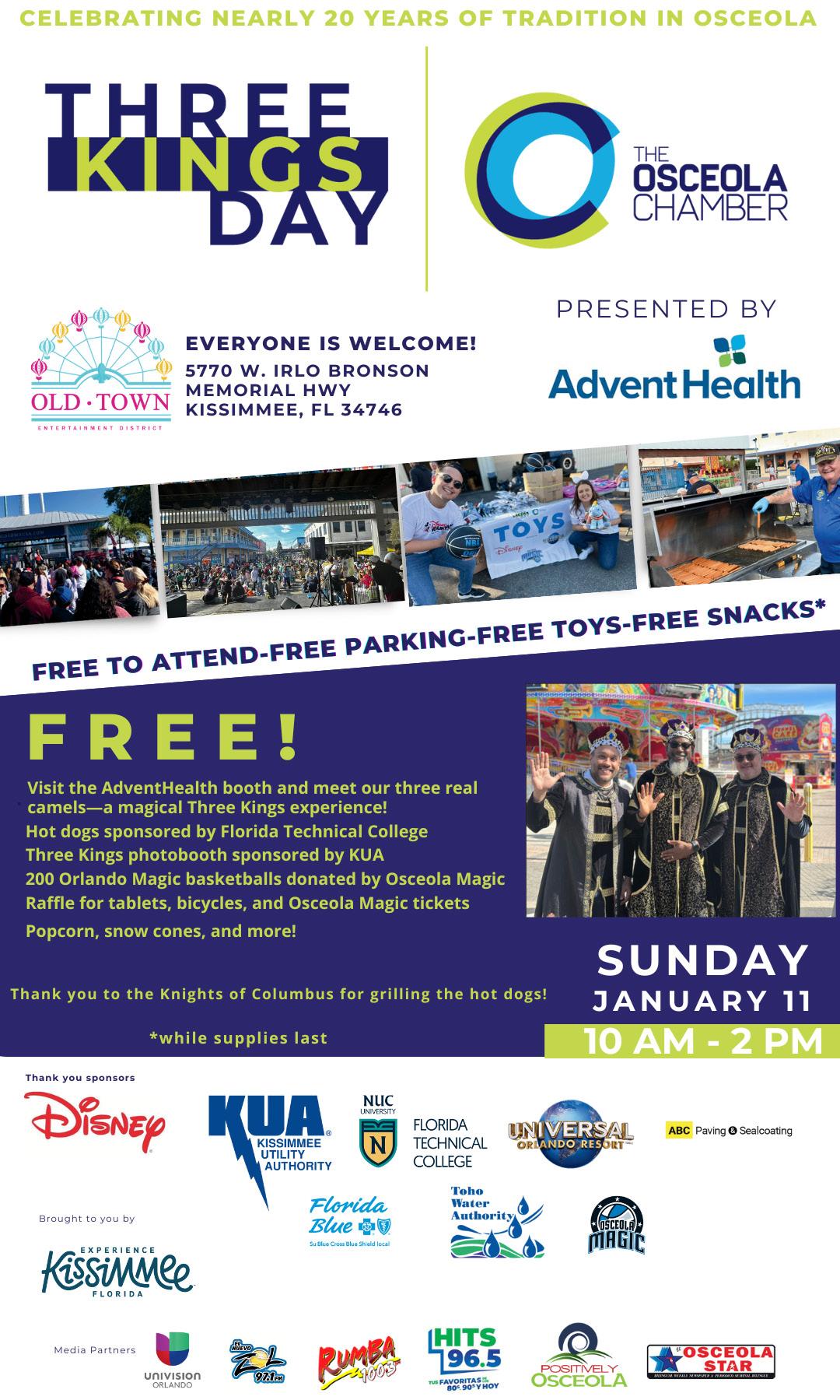 In addition to AdventHealth, Three Kings Day Osceola 2026 is sponsored by Florida Technical College, Kissimmee Utility Authority, ABC Paving & Sealcoating, Toho Water Authority, Osceola Magic, Florida Blue, Walt Disney World Resort, Universal Orlando Resort, and Experience Kissimmee.