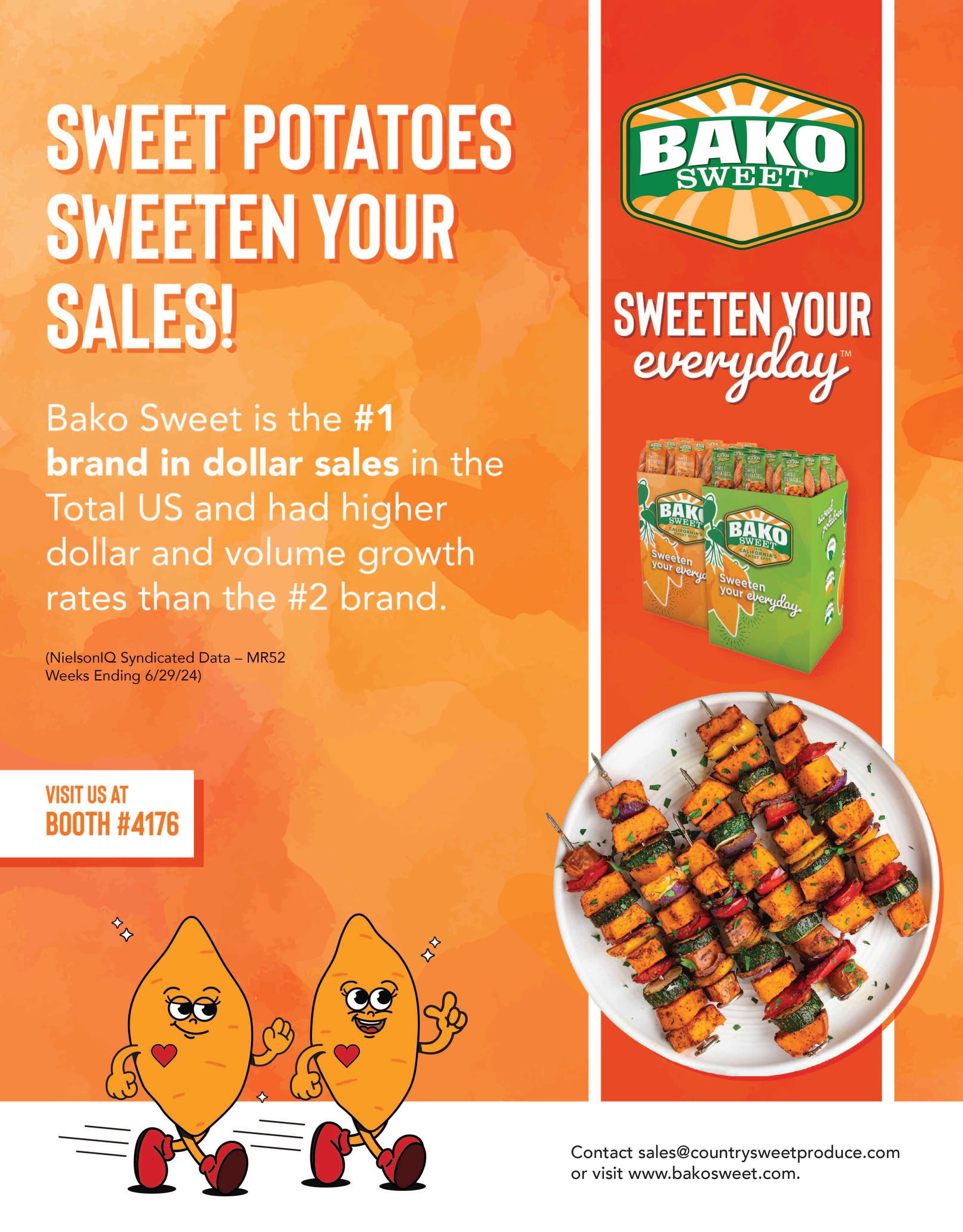a n d p o u n d s a l e s a c r o s s t h e U n i t e d States, with Bako Sweet leading as the No 1 sweet potato brand in dollar sales n a t i o n w i d e ( N i e l s e n I Q S y n d i c a t e d Data, 52 Weeks Ending 6/29/24). With 85% of consumers making unplanned p r o d u c e p u r c h a s e s , t h e b r a n d h a s leaned into merchandising as a competitive advantage Visually engaging displays, like its new Game Day bins, inspire impulse buys during high-energy shopping periods. By pairing that ins t o r e i m p a c t w i t h t i m e l y c o n s u m e r promotions, Bako Sweet reinforces its leadership position in the category